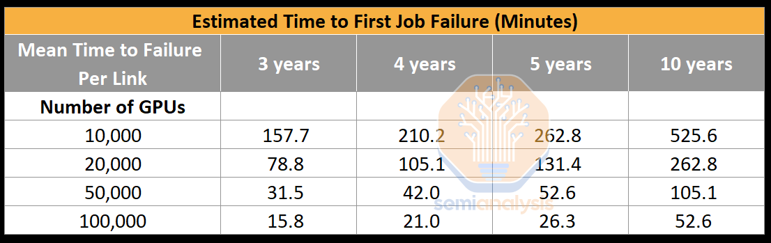 One of the most common problems encountered is Infiniband/RoCE link failure. Even if each NIC to leaf switch link had a mean time to failure rate of 5 years, due to the high number of transceivers, it would only take 26.28 minutes for the first job failure on a brand new, working cluster. Without fault recovery through memory reconstruction, more time would be spent restarting the training run in 100,000 GPU clusters due to optics failures, than it would be advancing the model forward.