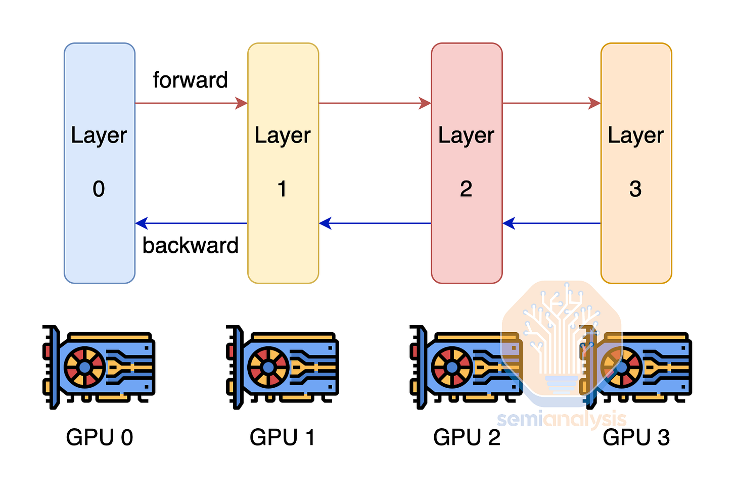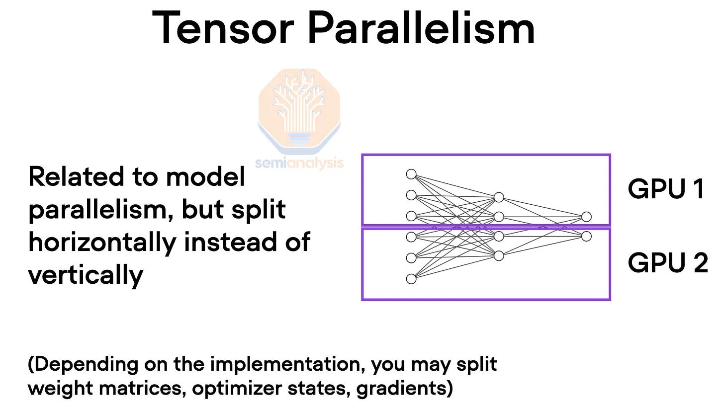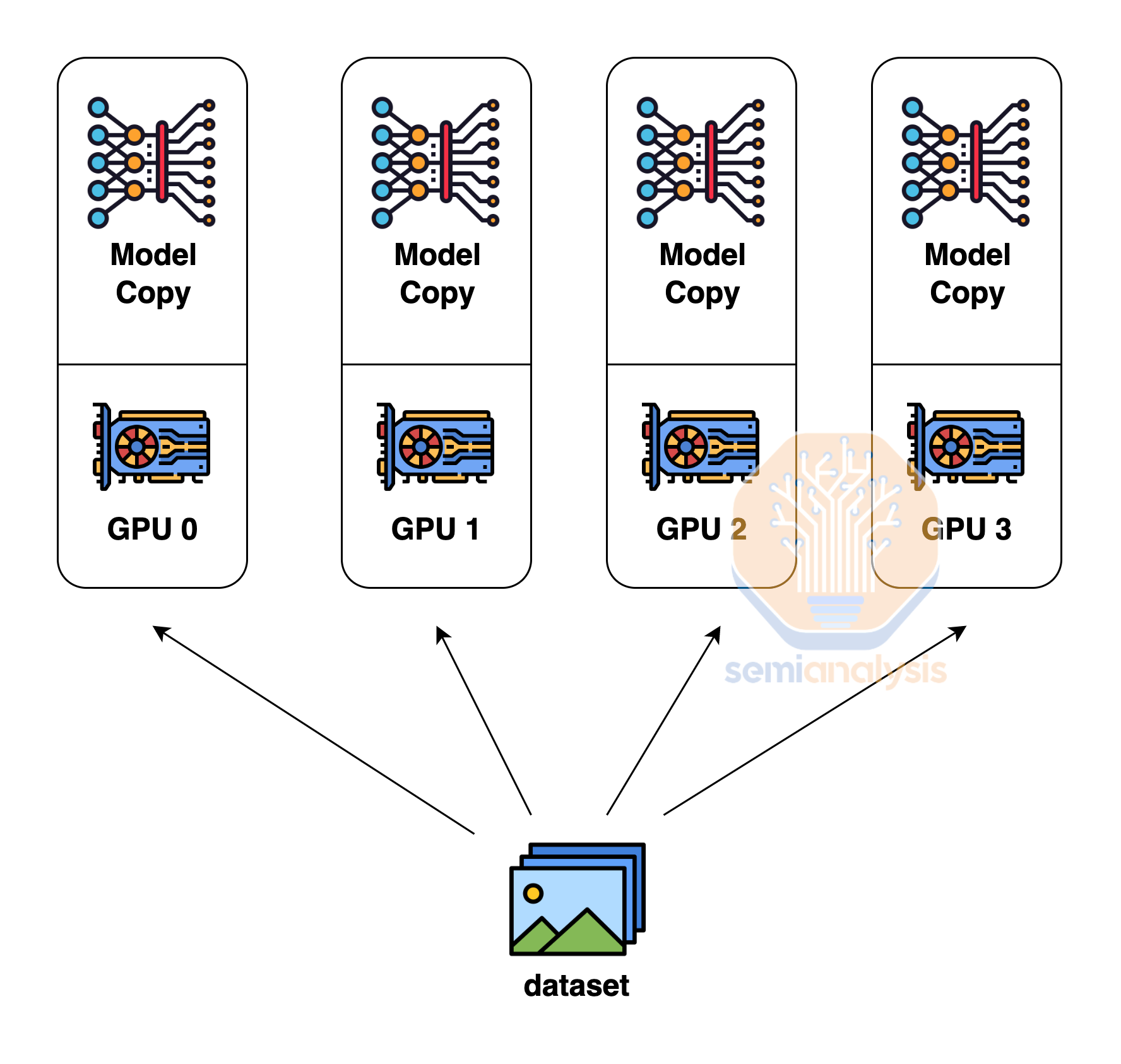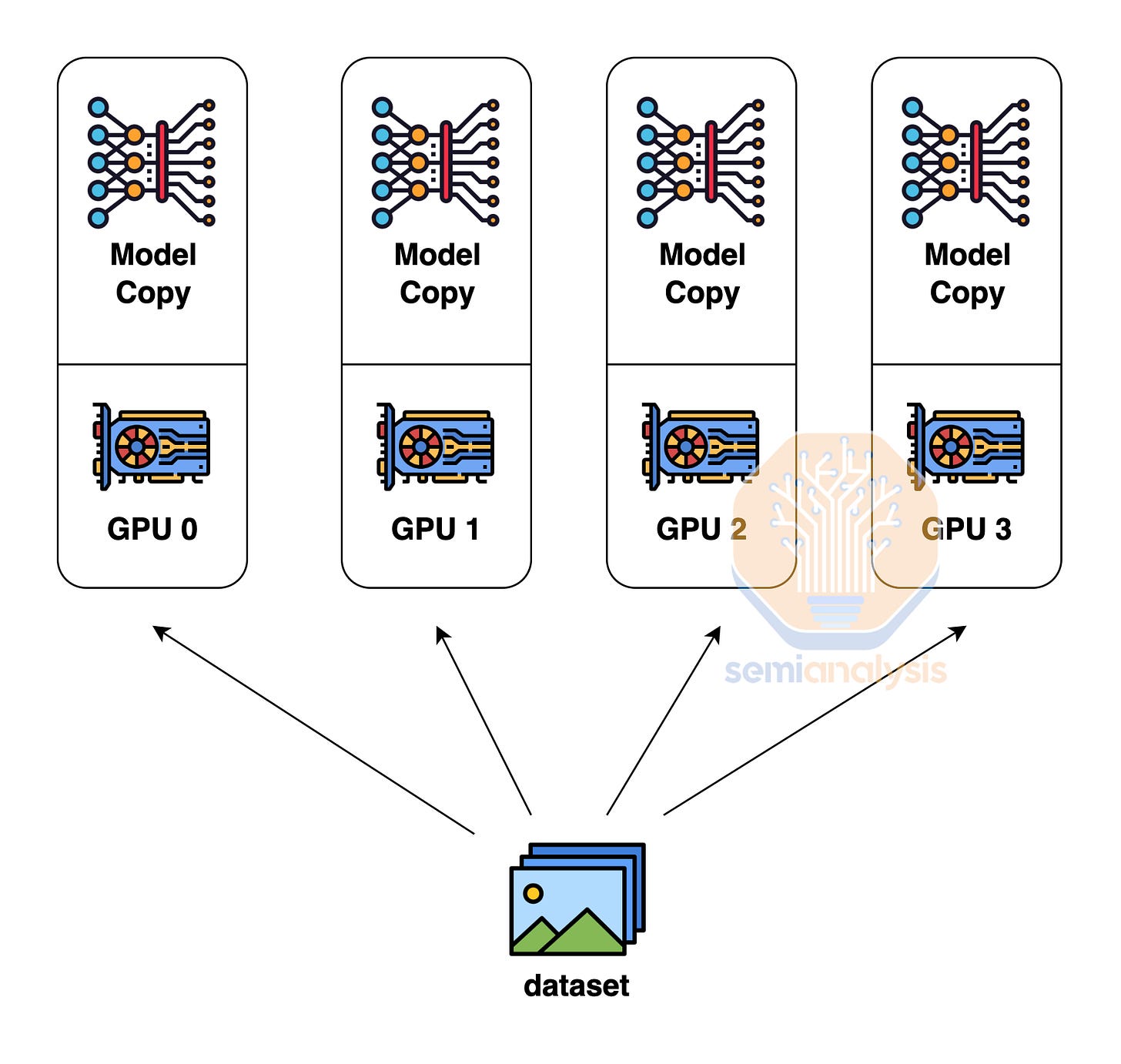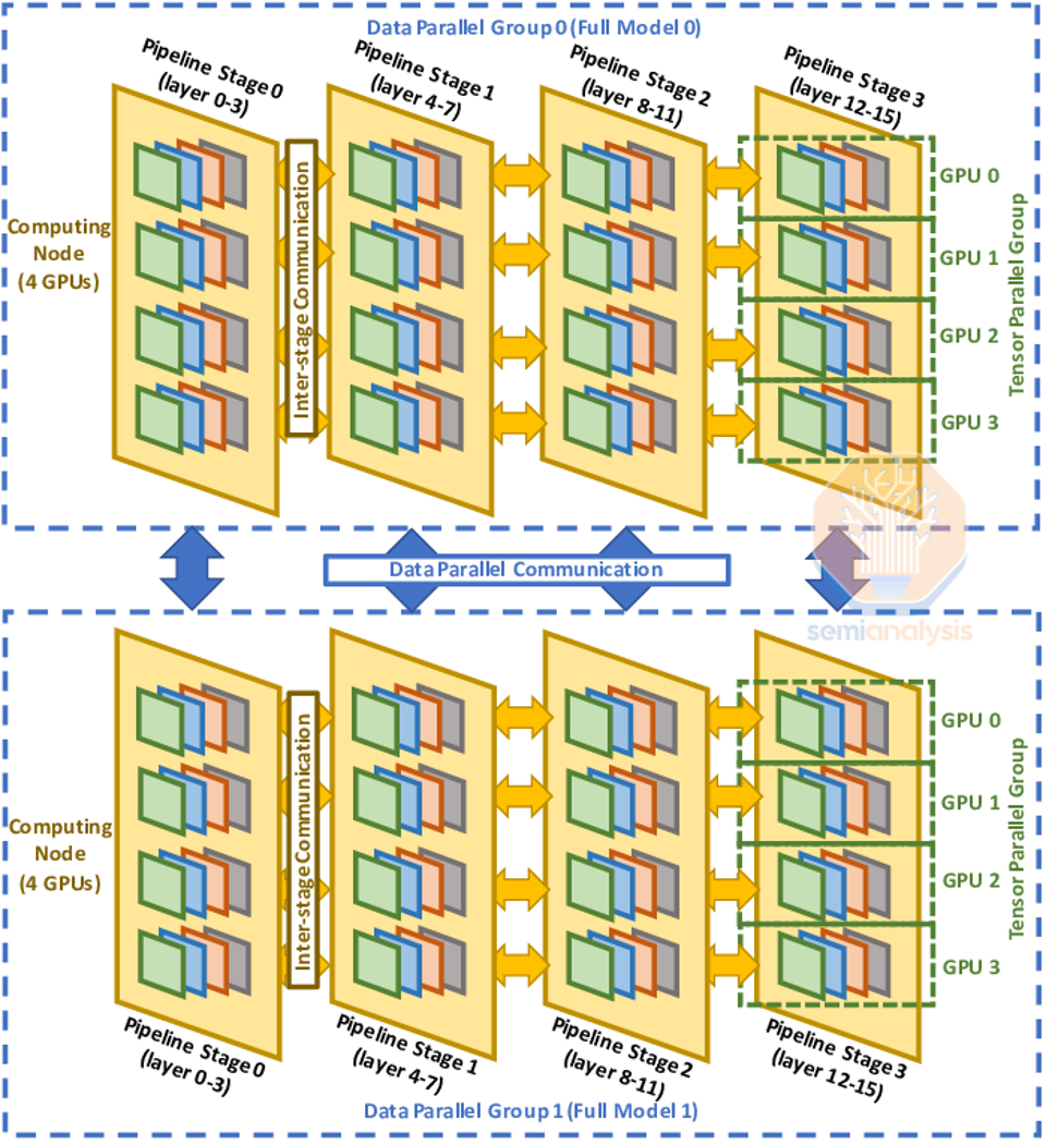 To understand network design, topology, reliability concerns, and checkpointing strategies, we will first do a quick refresher on the 3 different types of parallelism used in trillion parameter training - Data Parallelism, Tensor Parallelism, and Pipeline Parallelism. We have a comprehensive explanation of parallelism here, including Expert Parallelism.