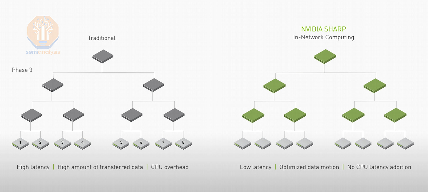An unfortunate downside of using Ethernet instead of InfiniBand for your GPU fabric is that Ethernet does not currently support SHARP in network reductions. In-network reductions work by performing the summation of each GPU by having the network switch run those computations. The theoretical network bandwidth increase of SHARP is 2x as it reduces the number of sends and writes each GPU has to do by 2x.