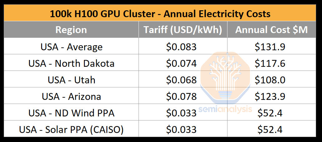 Multiple large AI labs including but not limited to OpenAI/Microsoft, xAI, and Meta are in a race to build GPU clusters with over 100,000 GPUs. These individual training clusters cost in excess of $4 billion of server capital expenditures alone, but they are also heavily limited by the lack of datacenter capacity and power as GPUs generally need to be co-located for high-speed chip to chip networking. A 100,000 GPU cluster will require >150MW in datacenter capacity and guzzle down 1.59 terawatt hours in a single year, costing $123.9 million at a standard rate of $0.078/kWh.