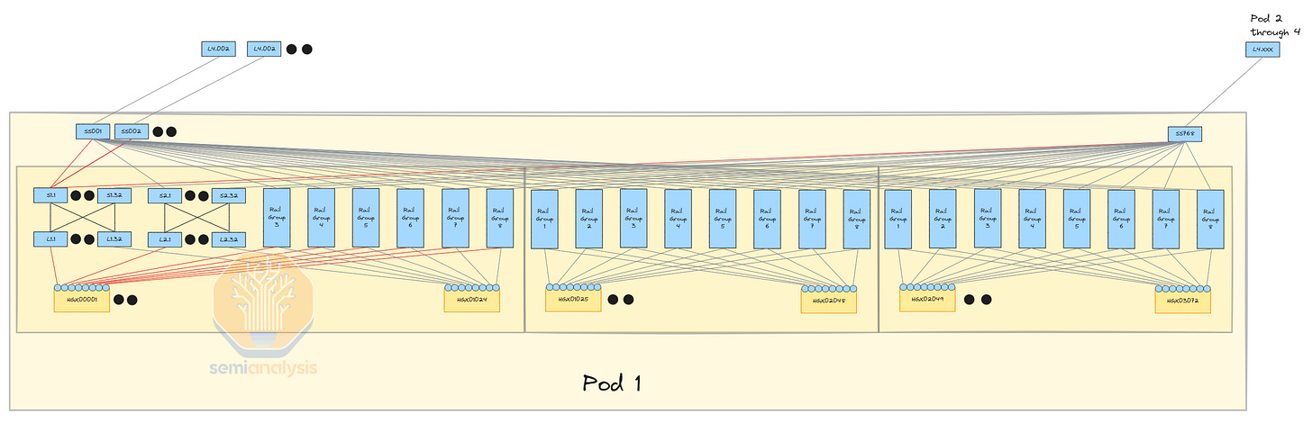 Each building will generally contain a pod or multiple pods of compute connected with cheaper copper cables or multi-mode transceivers. They will then use longer range transceivers in order to interconnect between “islands” of compute. The image below shows 4 islands of compute that have high bandwidth within the island but lower bandwidth outside the island. 155MW is challenging to deliver in a single location, but we are tracking over 15 Microsoft, Meta, Google, Amazon, Bytedance, X.AI, Oracle, etc data center build outs that will have that much space for AI servers and networking.
