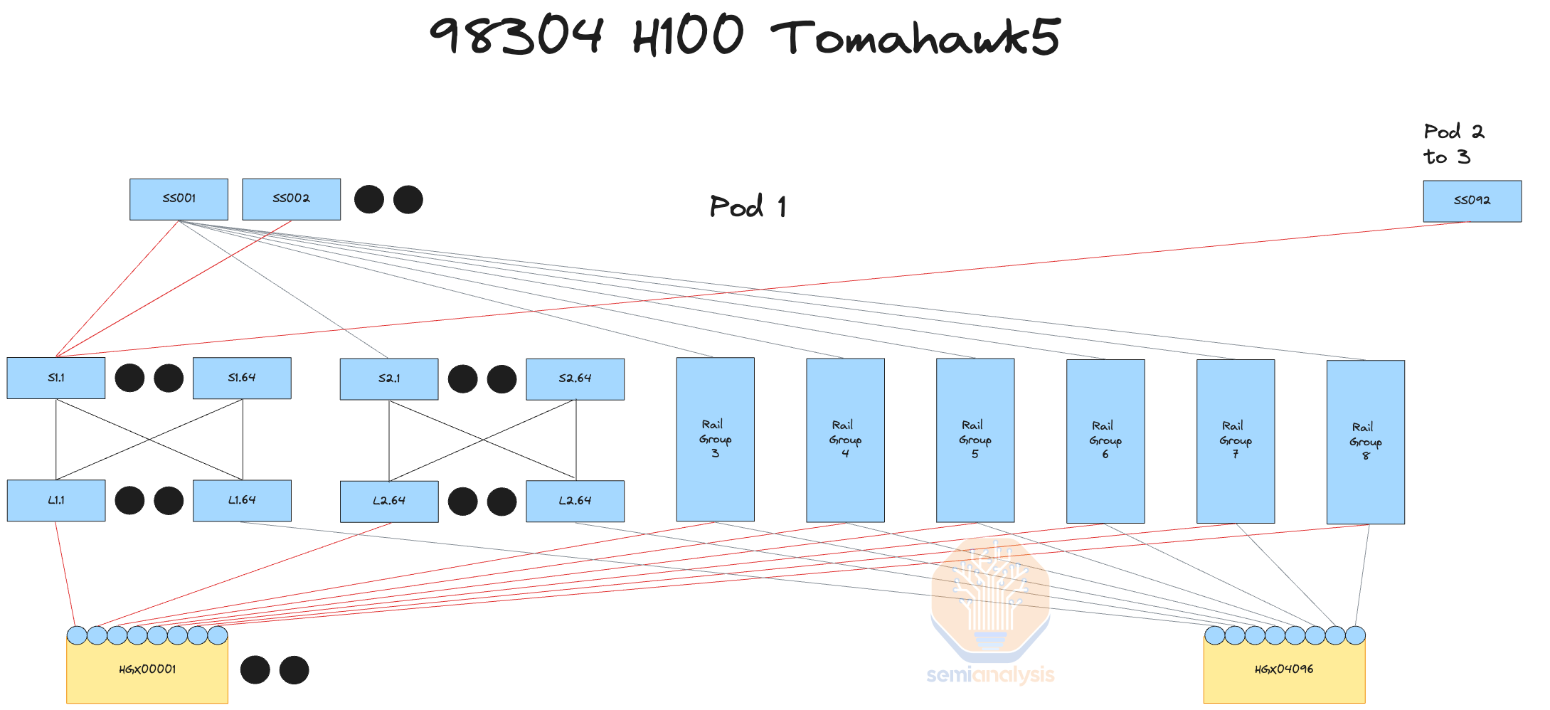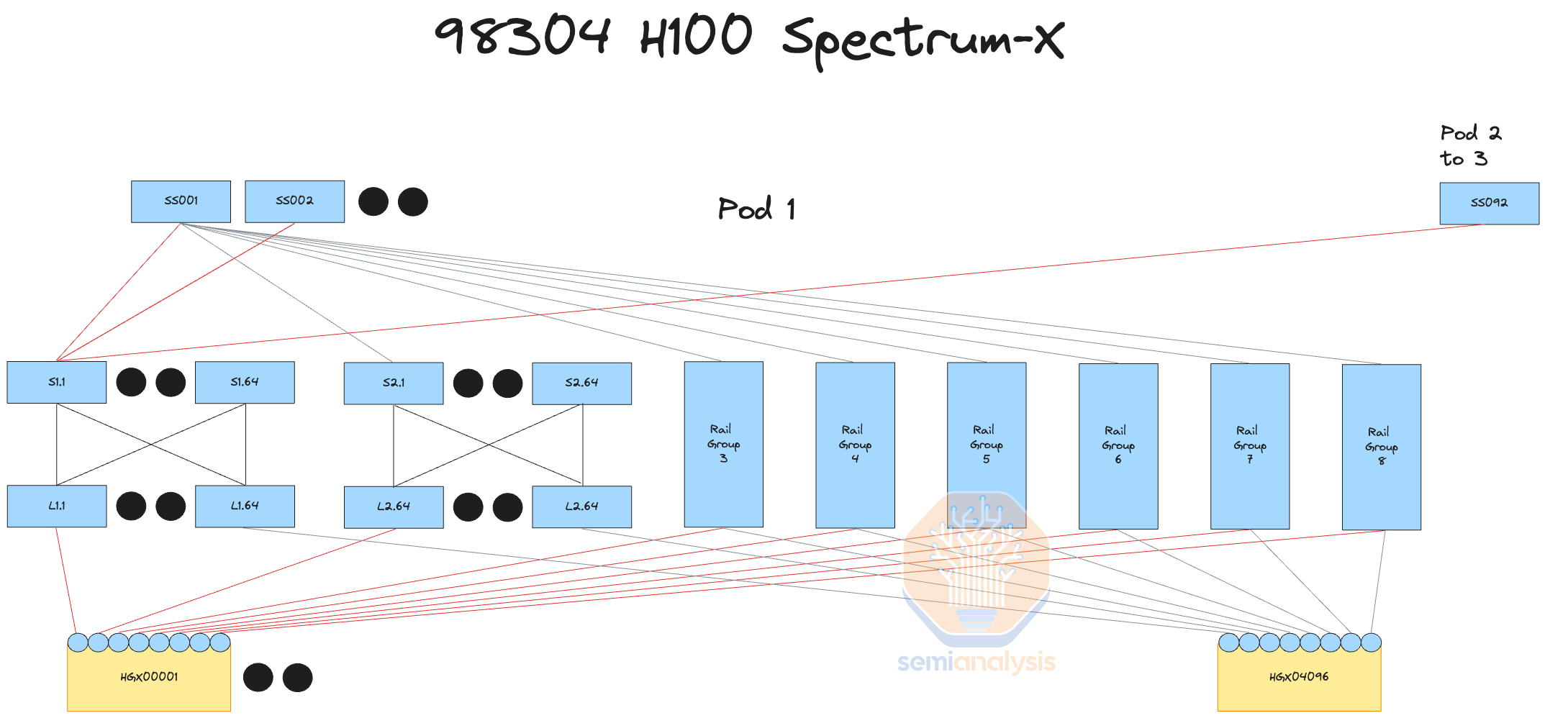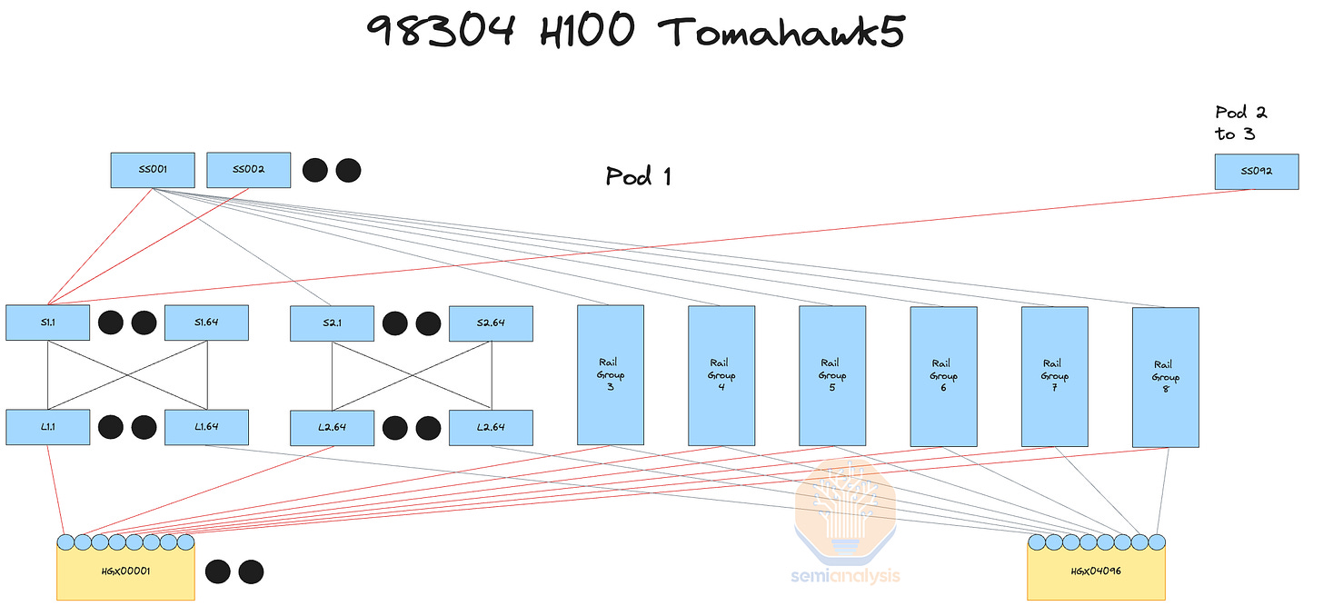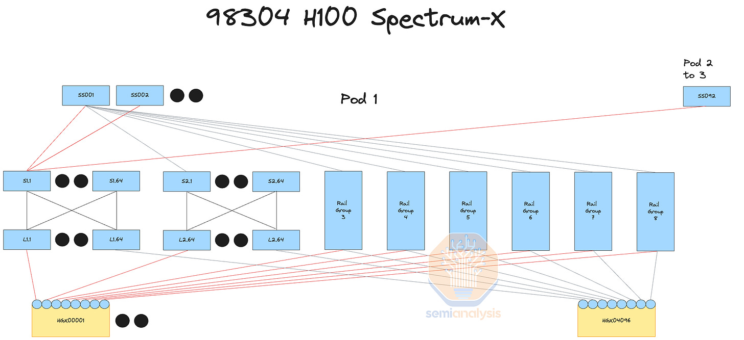 The alternative would be a 4 tier InfiniBand network with a 7:1 oversubscription with 4 pods with each pod having 24,576 H100s with a non-blocking 3 tier system. This allows for much greater flexibility for future bandwidth increases compared to using your frontend networking as it is way easier to add more fiber optics transceivers from a switch in building A to another switch in building B compared to doing a full frontend network NIC upgrade in every single chassis of the cluster to upgrade it from 100G to 200G, etc.