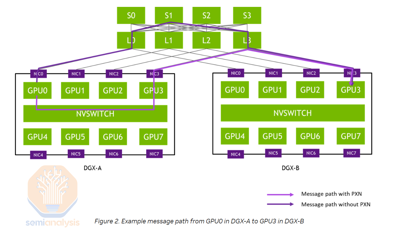 Since each GPU is directly attached to a ConnectX-7 NIC (through a PCIe switch), there is no fault tolerance at the network architecture level thus the fault must be handled at the user training code, directly adding to complexity of the codebase. This is one of the main challenges of current GPU network fabrics from NVIDIA and AMD, where even if one NIC fails, that GPU then has no alternative paths to talk to other GPUs. Due to the way current LLMs use tensor parallelism within the node, if even one NIC, one transceiver or one GPU fails, the whole server is considered down.