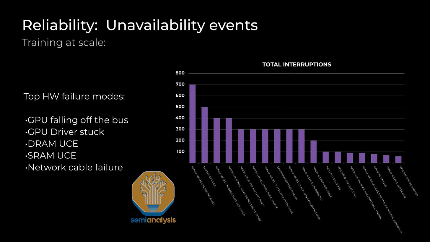 Reliability is one of the most important operational concerns with these giant clusters due to the synchronous nature of current frontier training techniques. The most common reliability problems are GPU HBM ECC error, GPUs Drivers being stuck, optical transceivers failing, NICs overheating, etc. Nodes are constantly going down or spitting out errors.