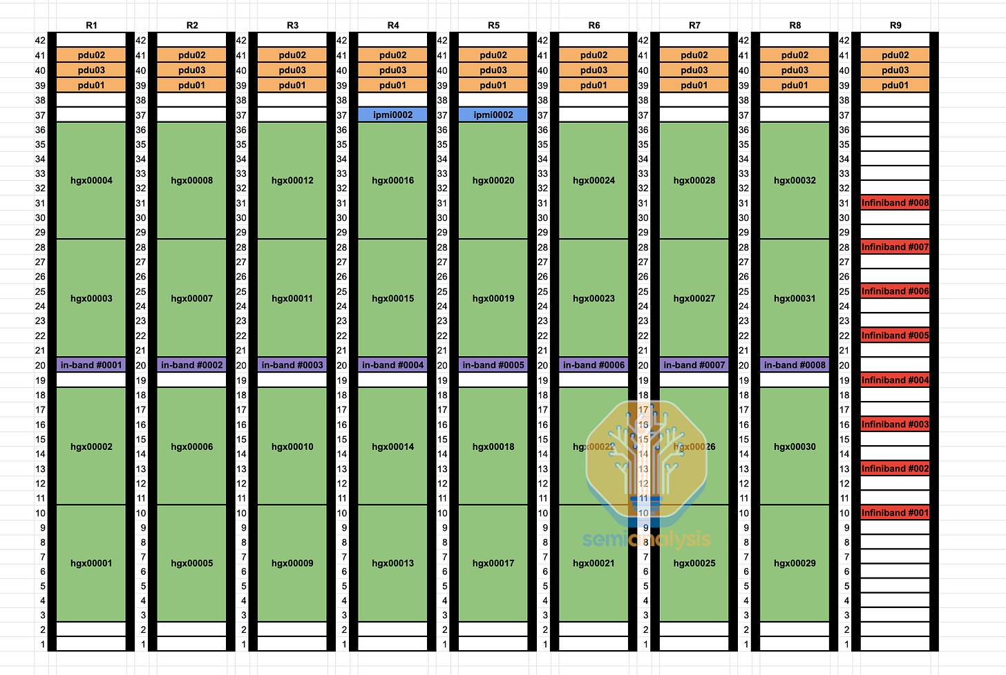 By using a non rail-optimized design, you can replace 98,304 optical transceivers connecting GPUs to leaf switches with cheap direct attached copper, leading to 25-33% of your GPU fabric being copper. As you can see from the below rack diagram, instead of each GPU to leaf switch connection going up to the cable tray then sideways 9 racks to a dedicated rail optimized leaf switch rack, the leaf switches are now in the middle of the rack allowing for each GPU to use DAC copper cables.