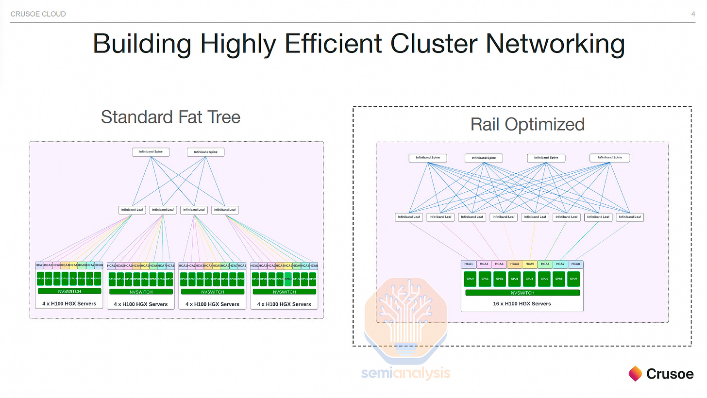 Small clusters of H100’s generally connect every GPU at 400G to every other GPU with only multi-mode transceivers through just a layer or two of switches. With large clusters of GPUs, more layers of switching must be added, and the optics becomes exorbitantly expensive. The network topology of such a cluster will differ broadly based on preferred vendor, current and future workloads, and capex.