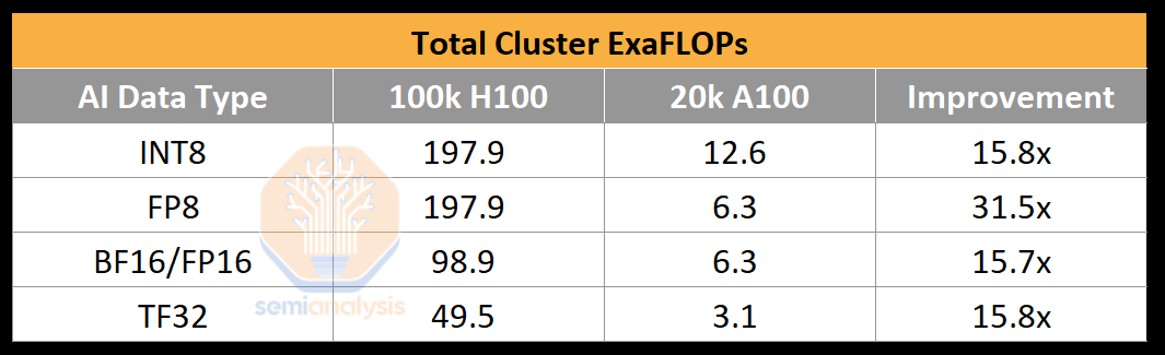 To put in perspective how much compute a 100,000 GPU cluster can provide, OpenAI’s training BF16 FLOPS for GPT-4 was ~2.15e25 FLOP (21.5 million ExaFLOP), on ~20,000 A100s for 90 to 100 days. That cluster only had 6.28 BF16 ExaFLOP/second peak throughput. On a 100k H100 cluster, this number would soar to 198/99 FP8/FP16 ExaFLOP/second. This is a 31.5x increase in peak theoretical AI training FLOPs compared to the 20k A100 cluster.