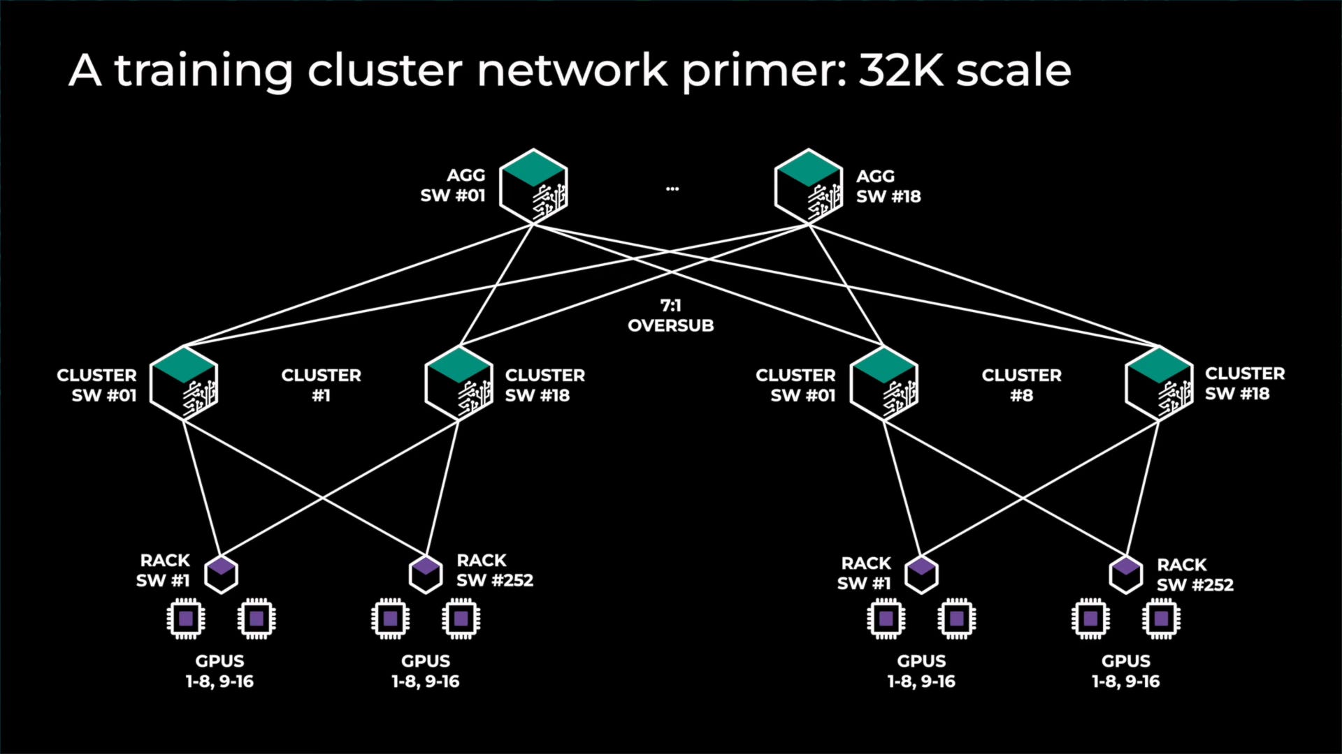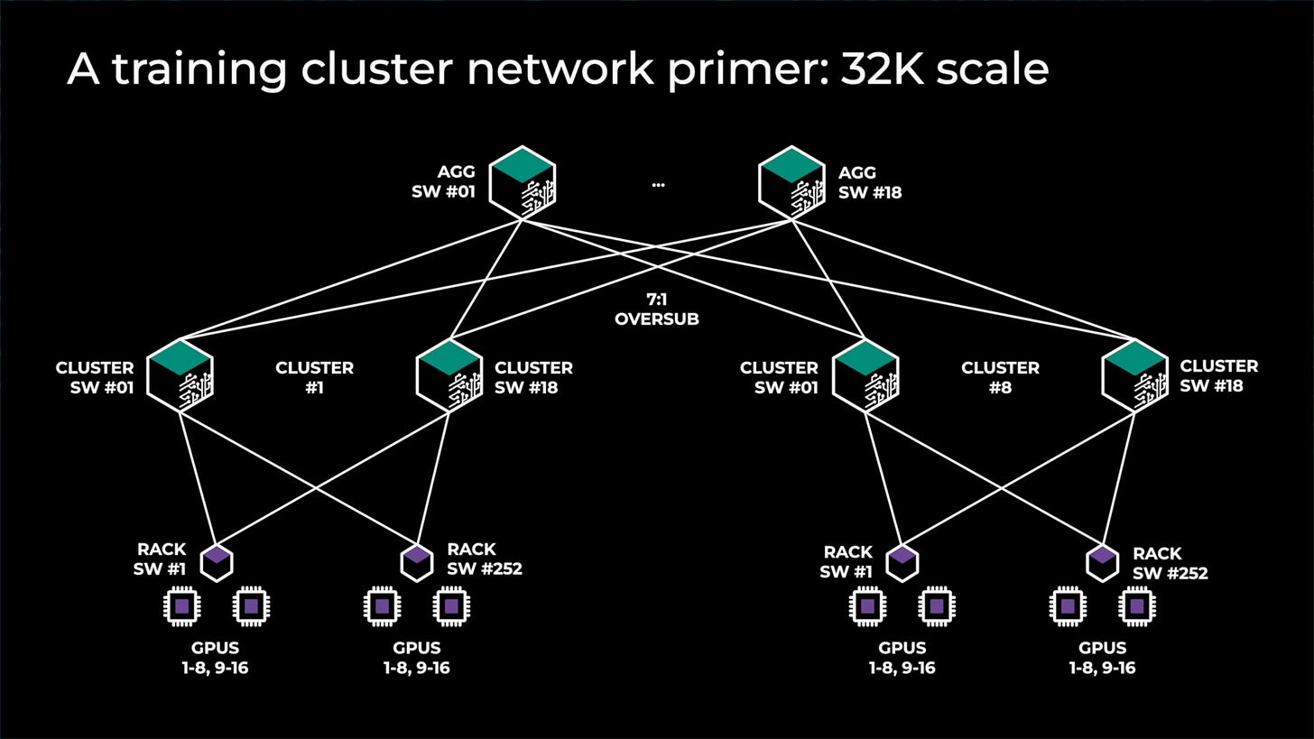 As such, noone deploys full fat tree architectures for large GPU clusters. Instead, they rely on making islands of compute that have full fat tree architectures alongside lesser bandwidth between these islands. There are a variety of ways to do this, but most firms are choosing to “oversubscribe” the top layer of networking. For example see Meta’s last generation architecture for GPU clusters up to 32,000. There are 8 total islands with full fat bandwidth between them, then another layer of switching on top that has 7:1 over subscription. The networking between islands is 7x slower compared to the networking within the island.