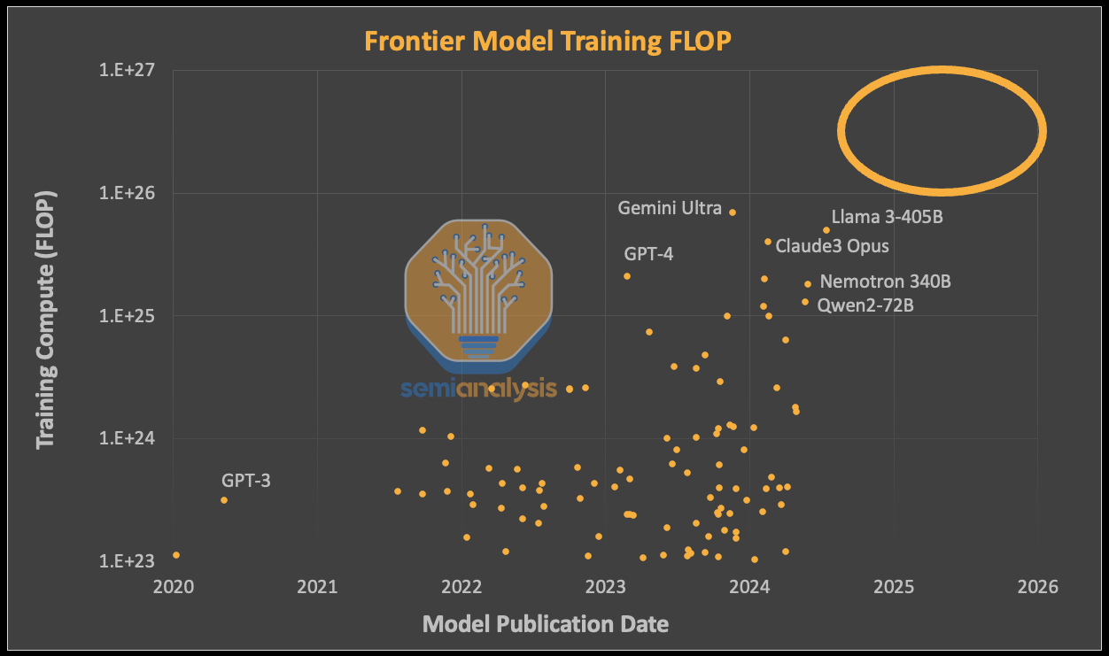 There is a camp that feels AI capabilities have stagnated ever since GPT-4’s release. This is generally true, but only because no one has been able to massively increase the amount of compute dedicated to a single model. Every model that has been released is roughly GPT-4 level (~2e25 FLOP of training compute). This is because the training compute dedicated to these models have also been roughly the same level. In the case of Google’s Gemini Ultra, Nvidia Nemotron 340B, and Meta LLAMA 3 405B, the FLOPS dedicated were of similar magnitude or even higher when compared to GPT-4, but an inferior architecture was utilized, resulting in these models falling short of unlocking new capabilities.