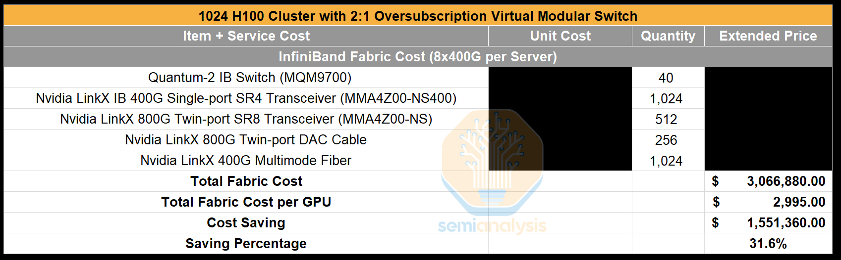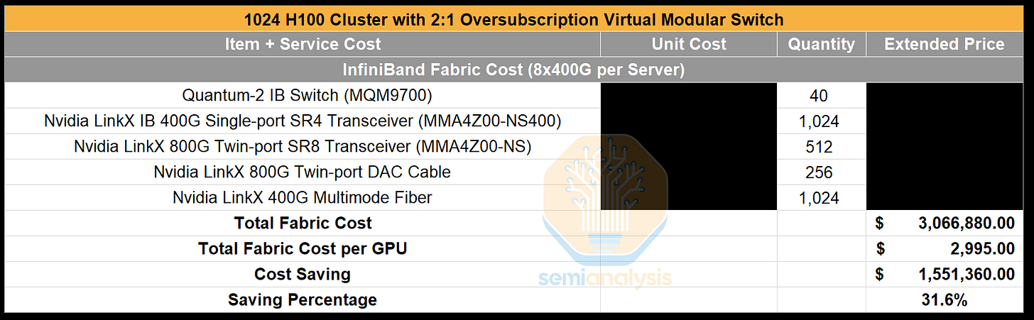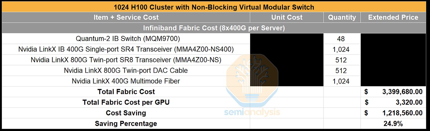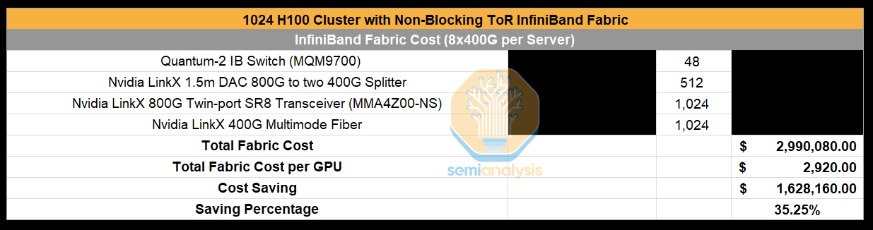 Even though the performance of this design is not particularly good for multi-tenant environments like Neoclouds, the cost savings are huge, saving 34.8% of the backend InfiniBand fabric cost.