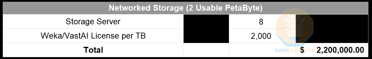 We will talk about the next most expensive part of an H100 cluster, networked NVMe storage. This is something that all customers want and is practically a requirement for running SLURM. There are basically only two line items for a storage deployment, your physical storage servers and your storage software vendor licenses such as with Weka or Vast Data, etc. These are the most popular vendors due to their channel partnerships with OEMs.