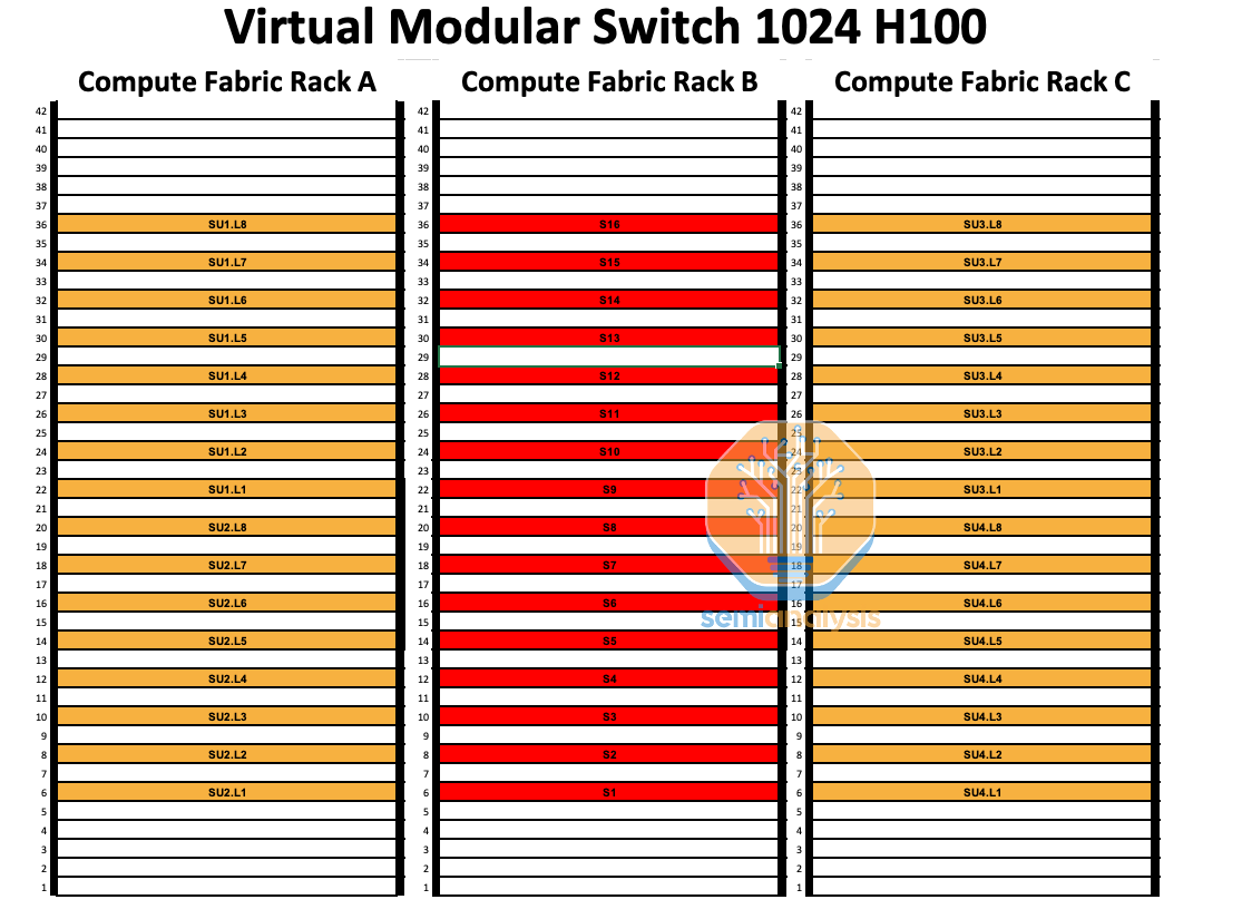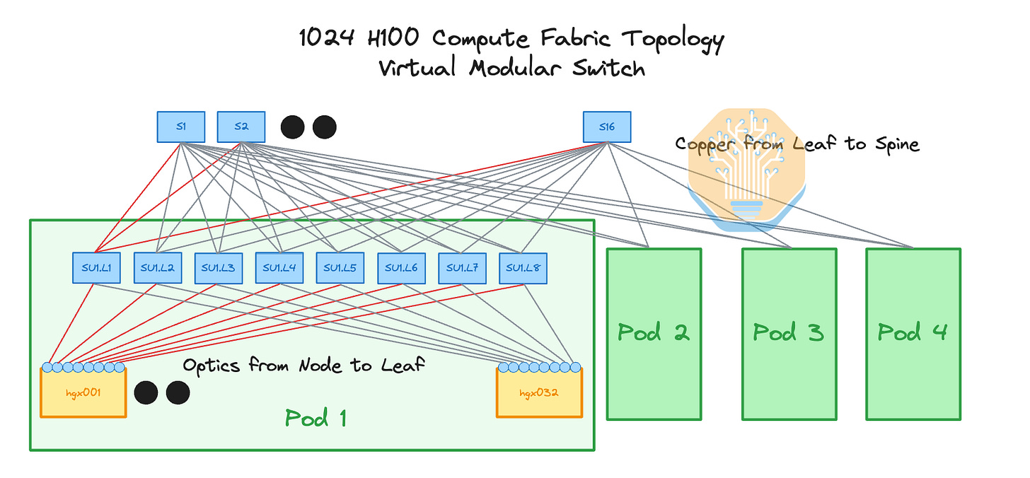 This is where a virtual modular switch comes in. It has the same logical topology as the Nvidia reference design but can use copper from the leaf switches to the spine switches due to clever floor planning and switch location planning.