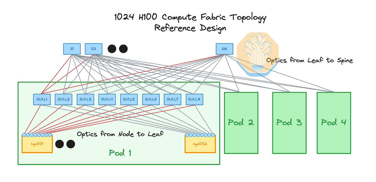 The Nvidia reference architecture also divides the cluster into 4 pods (also known as scalable units or SU), with each pod containing 32 HGX servers (256 H100s) and 8 rails. Each GPU index is always one hop away from the same GPU index in another server within the pod. This is important because it reduces network traffic on the spine switches which can easily be a congestion hotspot (even on non-blocking networks).