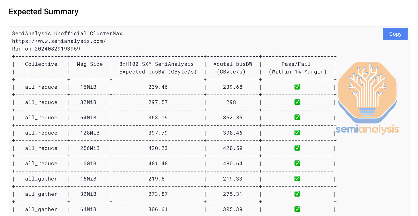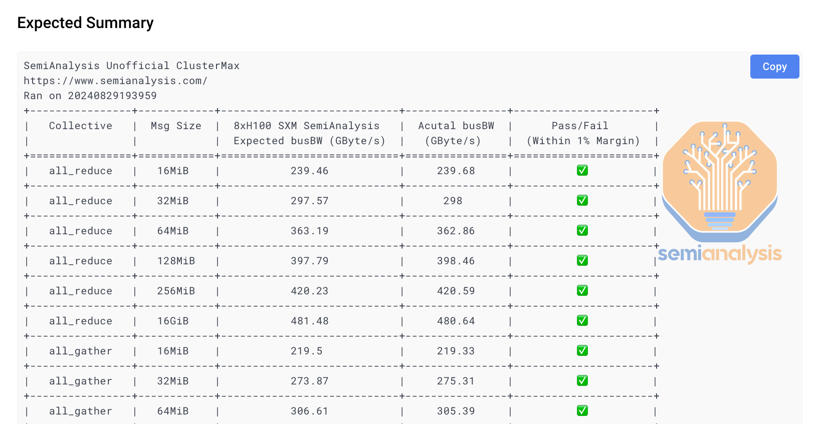 In order to make NCCL testing easy, we are developing a one liner function called ClusterMAX-NCCL to run and compare your cluster against a set of reference results.