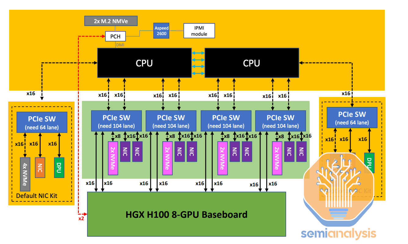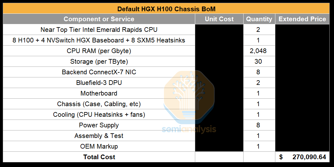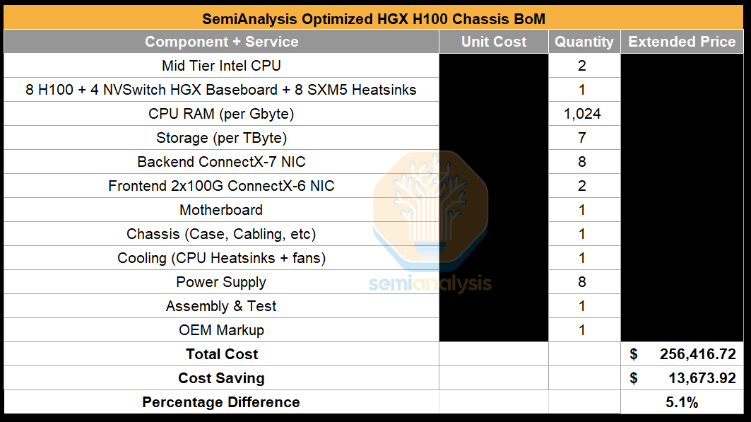 Putting these first few cost optimizations together, we estimate that there is a savings of $13.6k, bringing the cost of one compute node (i.e. one server) down from $270k USD to $256.4k USD - roughly a 5% savings. In a 1024 H100 cluster with 128 compute nodes, that is a savings of $1.74M USD. This pricing goes lower lower with solid volume. Contact us with help negotiating and designing.