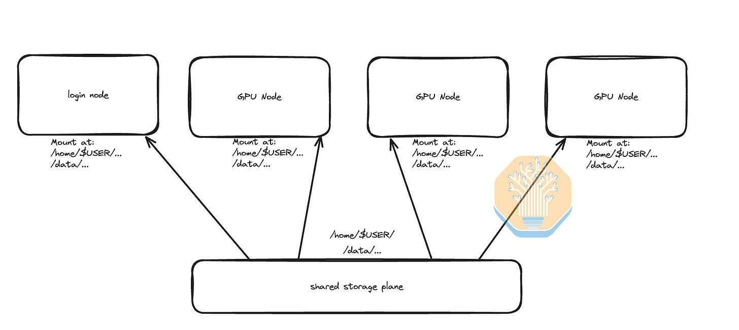 The next user requirement for a minimum valuable experience is having a snappy shared home directory and shared data storage directory. All GPU nodes and login nodes will have shared storage mounted at /home/$USER/ and at /data. What this really means is that when the end user can launch an interactive terminal into any GPU node, the node will have the same home directory and files. This is fantastic as it means that every GPU Node allocated to the user is fungible and the user need not care about exactly which GPU server they are using. Furthermore, when launching multi-node training jobs, all of the user’s code is automatically on every GPU node so the user doesn’t need to manually copy code over ssh (scp) to each node.