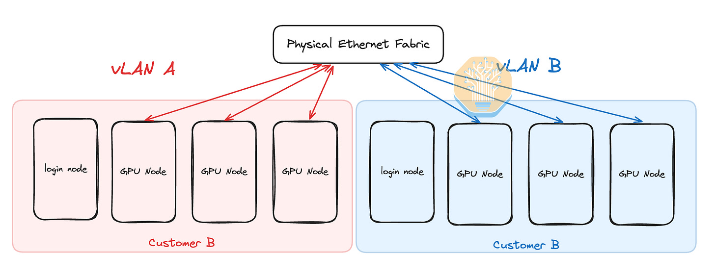Unless an entire customer (tenant) rents the whole physical cluster out for a long term, each physical cluster will probably have multiple concurrent customers. This means that you need to provide isolation of the frontend Ethernet and backend InfiniBand networks as well as implement isolation of storage between customers. Each customer will typically be renting each GPU server as a whole unit, that means on compute server virtualization is not strictly needed as there is only one customer per physical server. Spending time on subdividing nodes is not worth it. Isolation is easy to set up for the frontend ethernet network using the standard vLANs. In vLAN, while the physical ethernet fabric is shared, each customer’s nodes are only able to talk to other nodes that are assigned to the same customer.