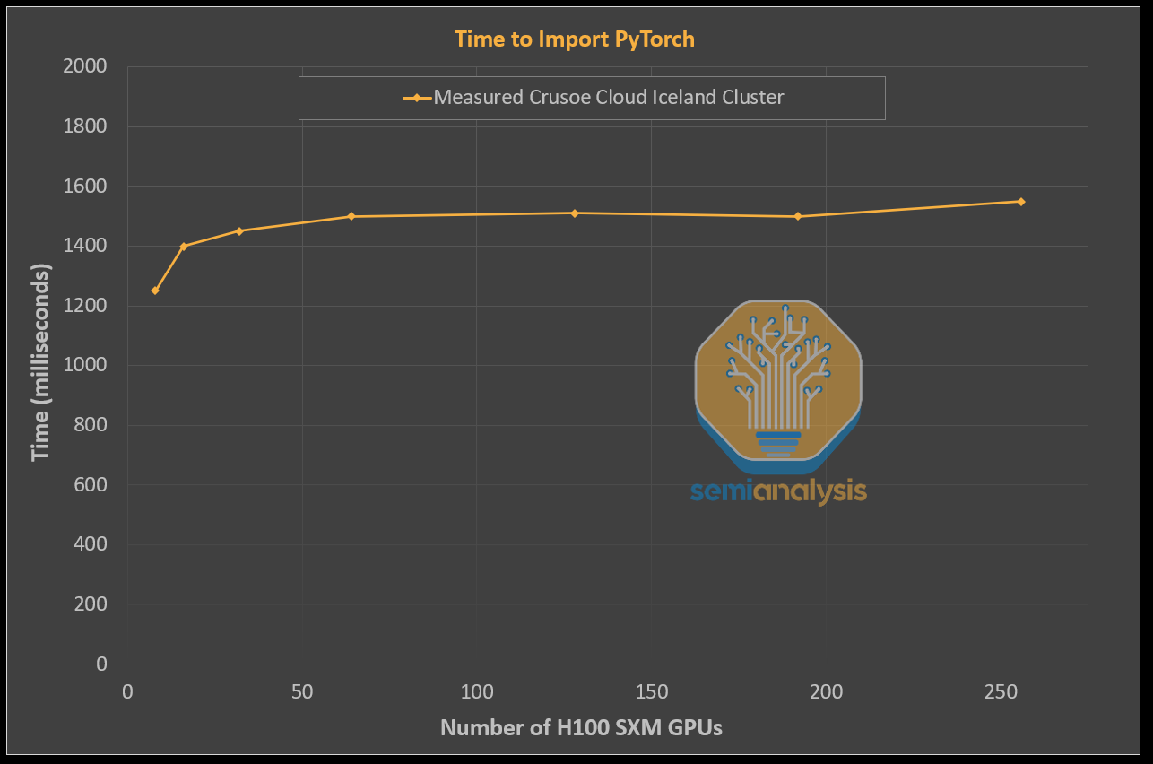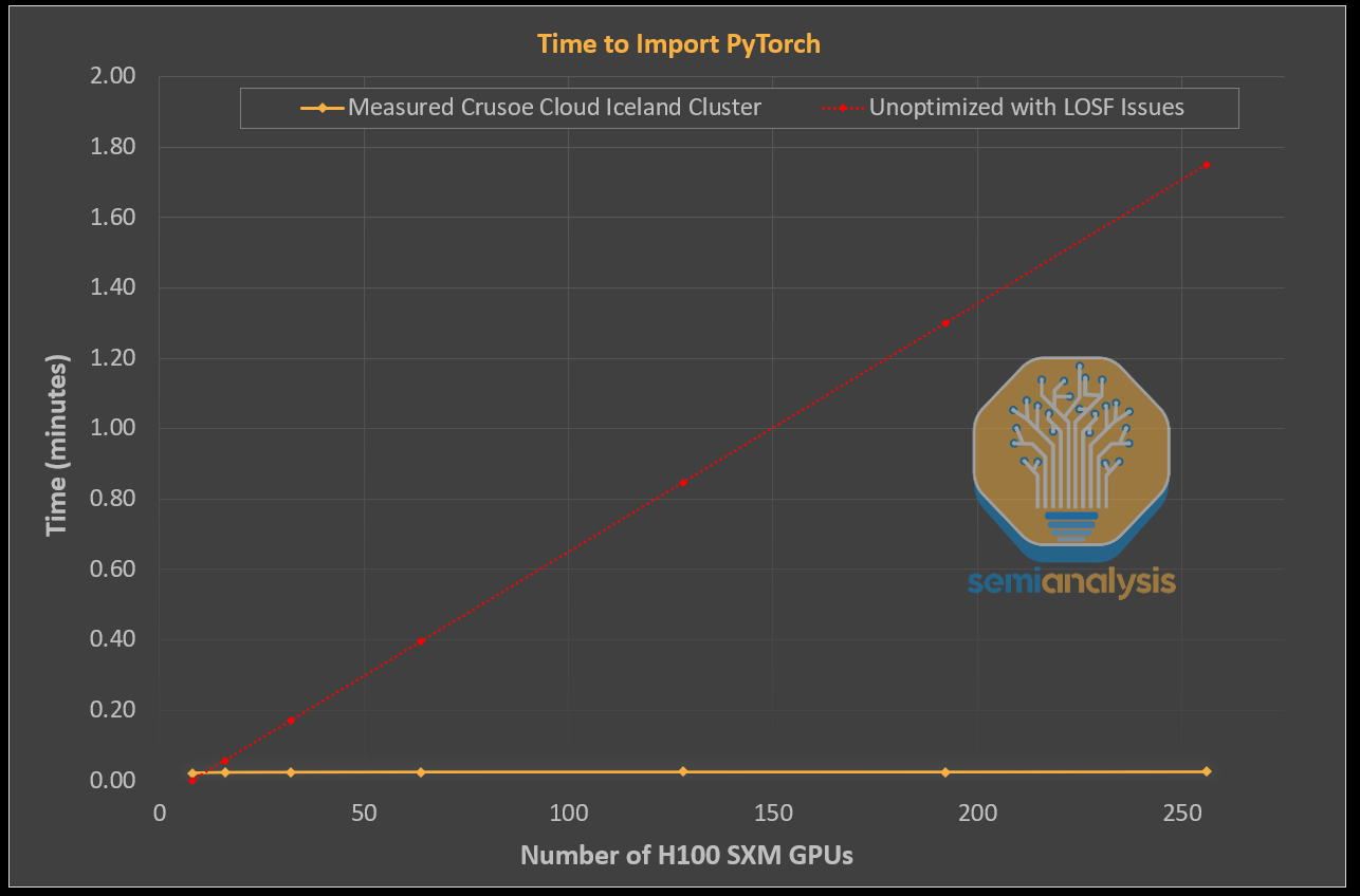 This is a world of difference to a cluster that is running on unoptimized shared storage, where the time required to import PyTorch in a Python multi node training run explodes, often causing the cluster to be completely unusable. Notice the difference between Crusoe, the gold standard, and how another cluster with LOSF issues would behave.