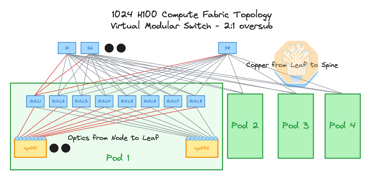 The benefit of this design is that instead of requiring 16 spine switches for 1024 H100s, you only need 8 spine switches. When combining a 2:1 oversubscription with the Virtual Modular Switch design, we can have fewer switches in the middle rack. This means cable management is much easier. Another benefit is empty ports on your leaf switches so in the future, when you have heavier inter-pod traffic, you can easily add more spine switches and reduce the degree of oversubscription.