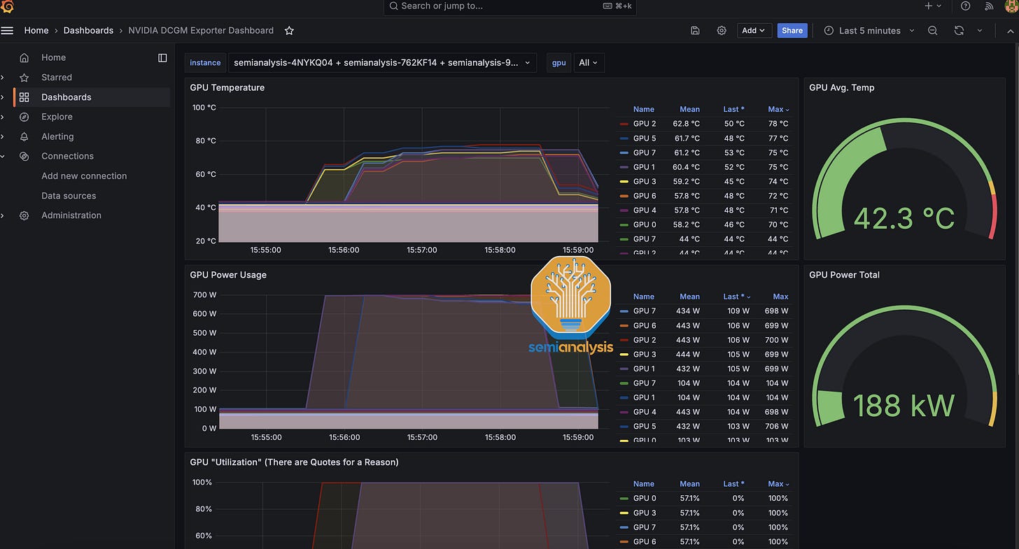 Cluster deployments typically leverage OEMs’ rack scale integration and deployment teams. These teams will integrate and test at the individual server level and at the cluster wide level during which networking testing will be carried out at OEMs’ integration factory. We recommend that the cluster wide high temp burn in should last at least 3-4 weeks to catch all the infant mortality related failures among the node’s components. It is extremely common for integration teams to pitch using LINPACK as their burn in and acceptance process, but we don’t believe that this is a very good test as LINPACK does not utilize the network much nor does it sweat the GPU’s HBM memory very much, instead only utilizing and testing the GPU’s FP64 cores. ML Training by contrast is very network, HBM and BF16/FP16/FP8 tensor core intensive and as such, we believe that a burn in and acceptance test that actually burns in related components is needed.