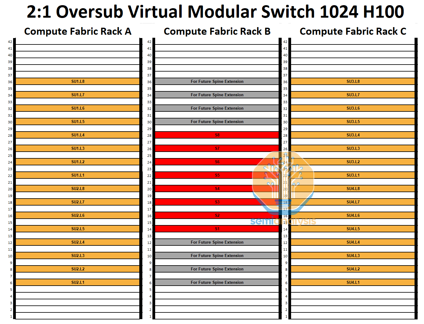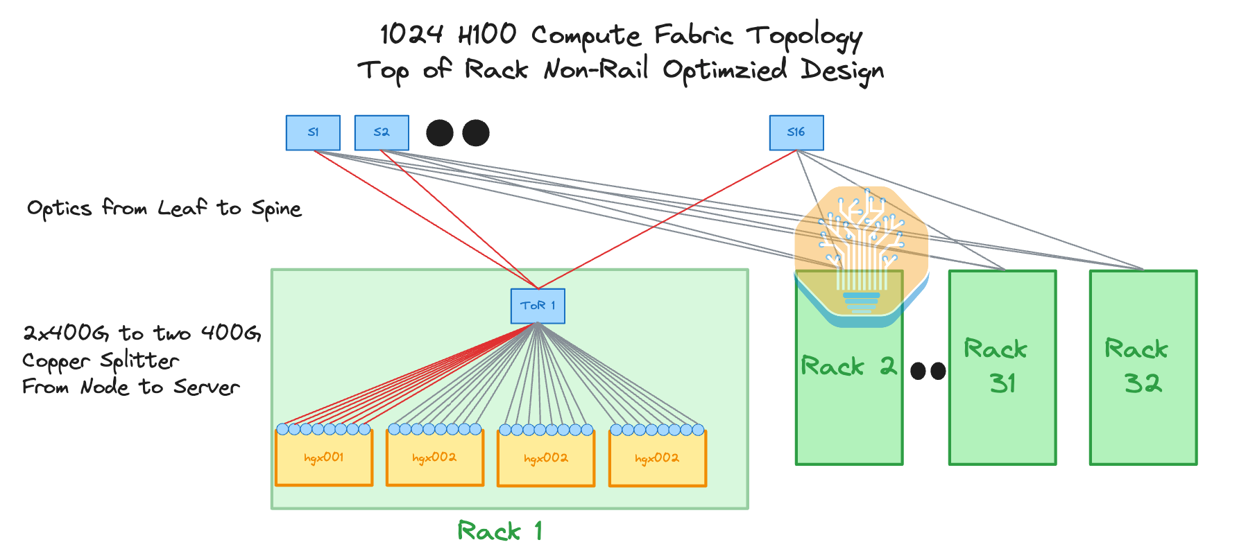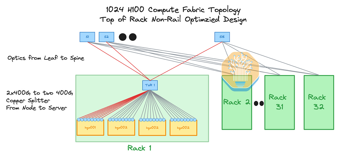 On Meta’s 24k H100 cluster, they implemented a 7:1 oversubscription between pods, but we believe that designing in a more conservative oversubscription makes more sense, and we recommend using just a 2:1 oversubscription for small clusters.