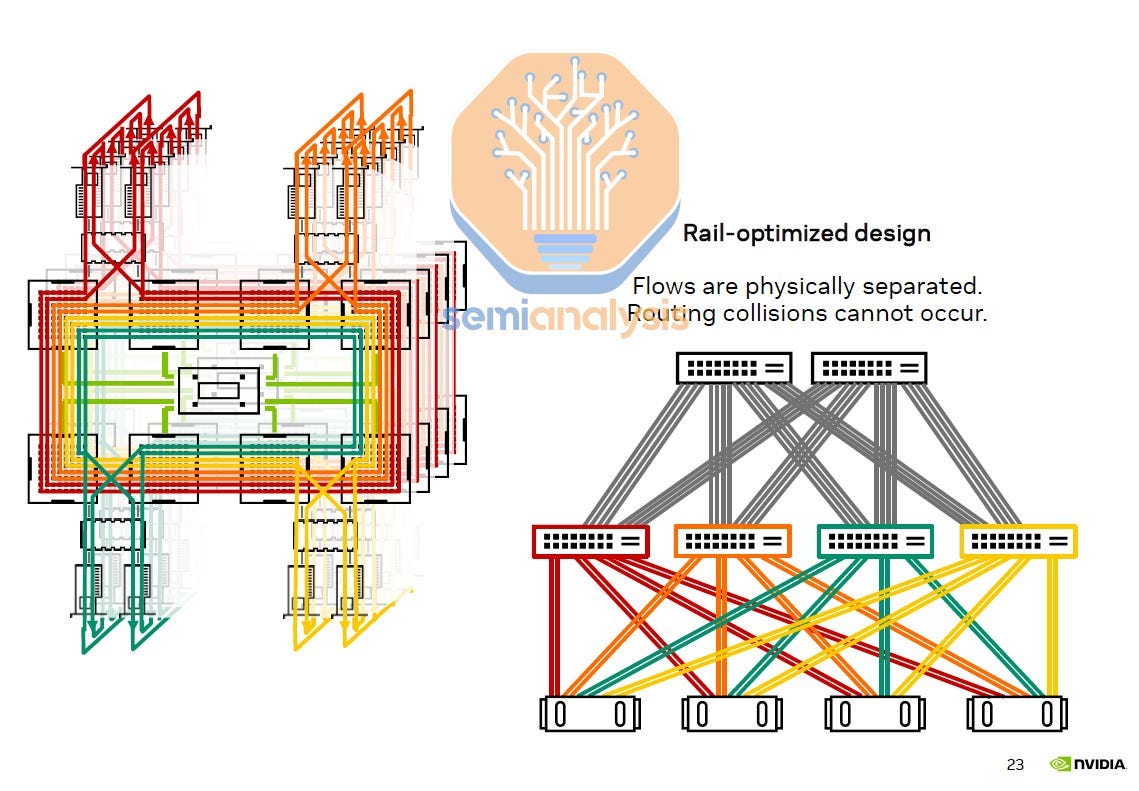 Contrary to popular belief, being rail optimized and reducing top level traffic/congestion is especially important in multi-tenant environments such as an GPU Neoclouds where you will very often have multiple tenants/customers. In an 8-rail optimized network, all 8 flows from each workload are physically separated, thus routing/switching collisions cannot occur. In our upcoming Nvidia NCCL and AMD RCCL collective deep dive, we will discuss the benefits of rail optimized configurations and why congestion can be a serious problem, especially for multi-tenant environments such as AI Neoclouds.