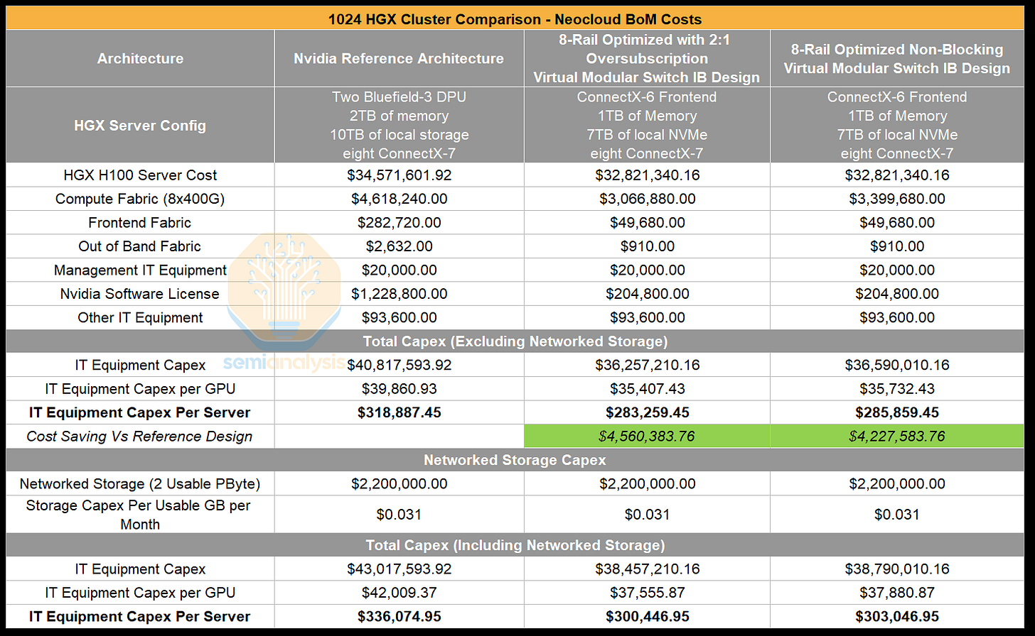 As you can see below, with the Nvidia Superpod Reference Architecture (RA), the all-in cost for the cluster comes up to ~$318k per compute server (excluding storage), but using the SemiAnalysis Optimized Architecture with a 2:1 oversubscription, total all-in cost will just be $283k per compute server (also excluding storage). We have helped Neoclouds optimize further beyond shown through negotiation help, and further cost cutting especially on larger clusters.