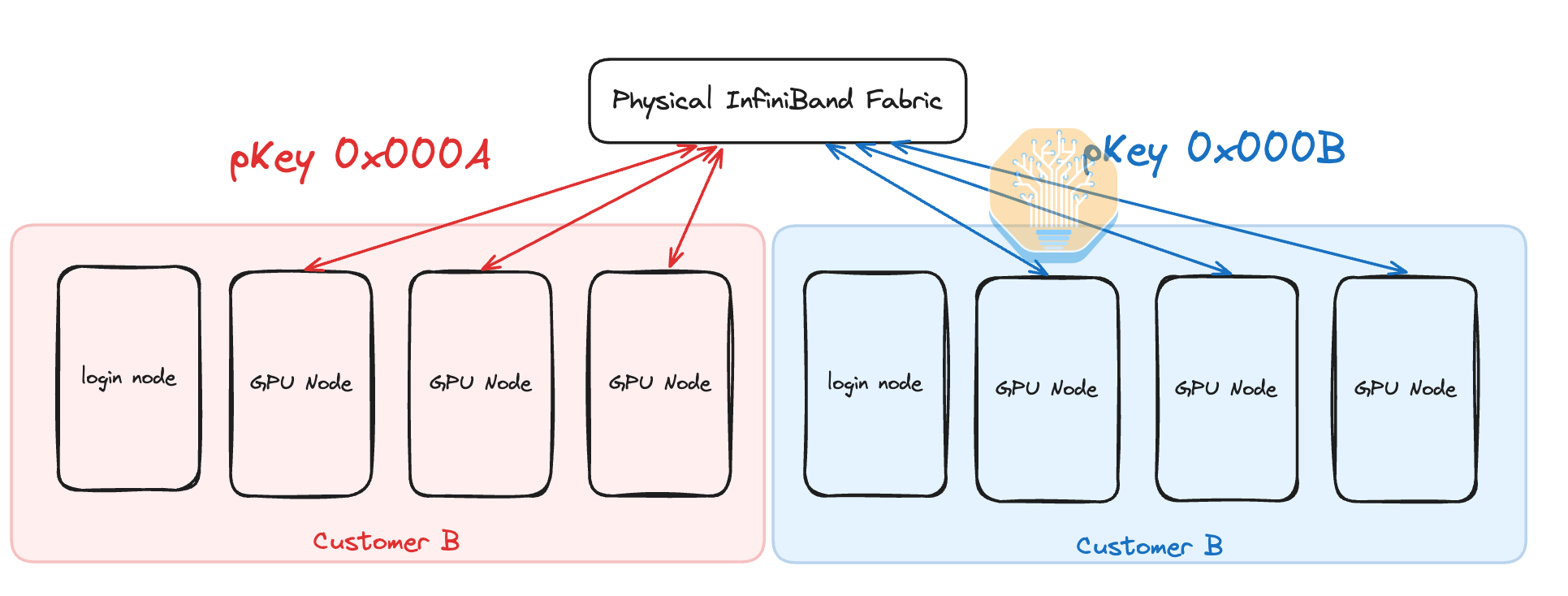 InfiniBand multi- tenancy is not as easy to set up and automate when compared to Ethernet vLAN, but the learning curve is very quick. In the InfiniBand universe, network isolation is accomplished using Partition Keys (pKeys) - essentially the same concept as vLAN. Each customer gets its own isolated InfiniBand network through pKeys and only nodes with the same pKeys can talk to each other.