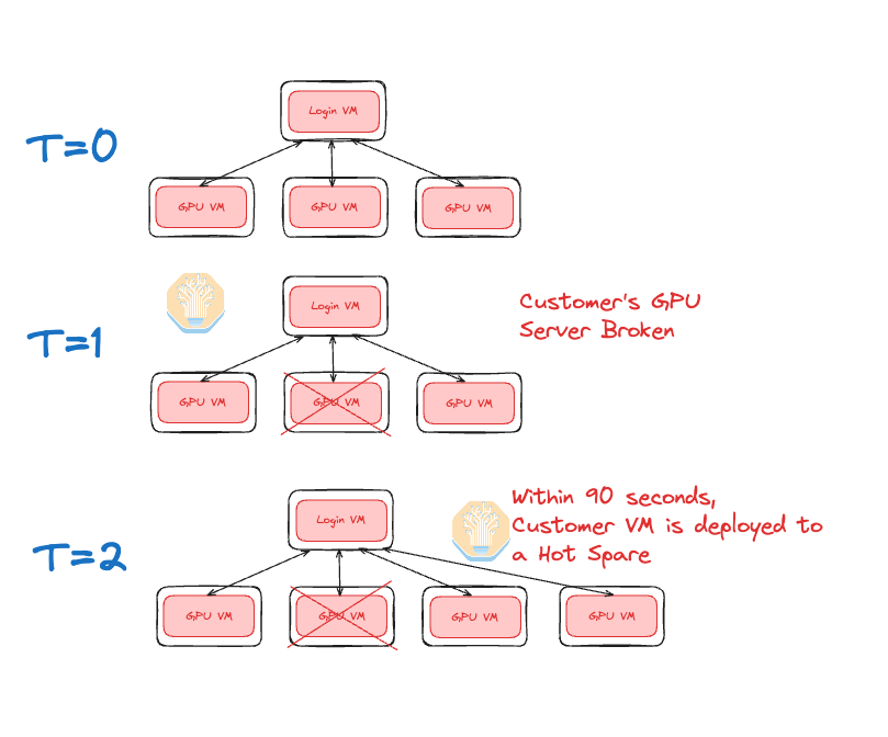 When using VMs, if a physical GPU server being used by a customer breaks, then the Neocloud is able to easily migrate or spin up a new VM for the customer on a hot spare.