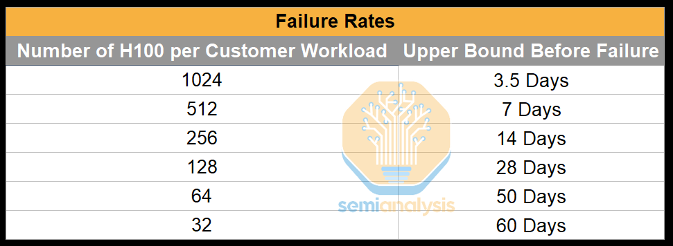 We see that a top tier H100 operator typically experiences a mean time between failures of 7 days for a cluster that has 512 H100s. For these top tier operators, most of the time, failures are easily fixable by just restarting the node.