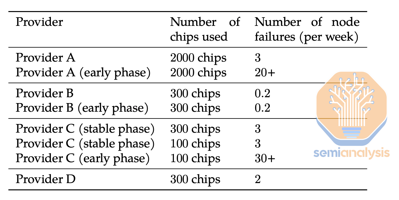 As mentioned above, failures are very common during the early phase of a Neocloud cluster as most Neoclouds do not burn in their cluster before giving them to customers. As Yi Tay noticed, clusters that do not do burn are orders of magnitude worse when it comes to reliability than clusters that do conduct burn in testing.