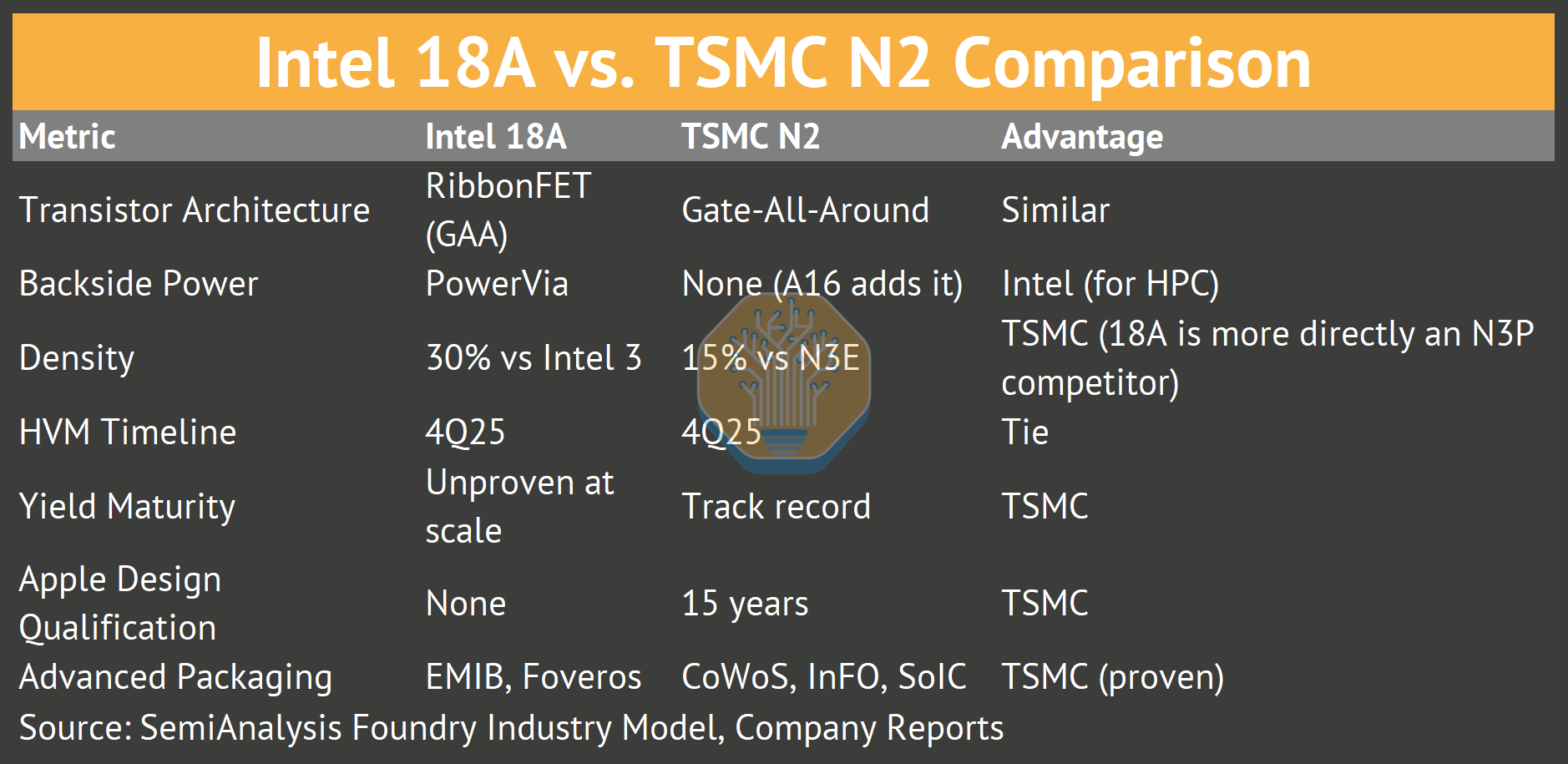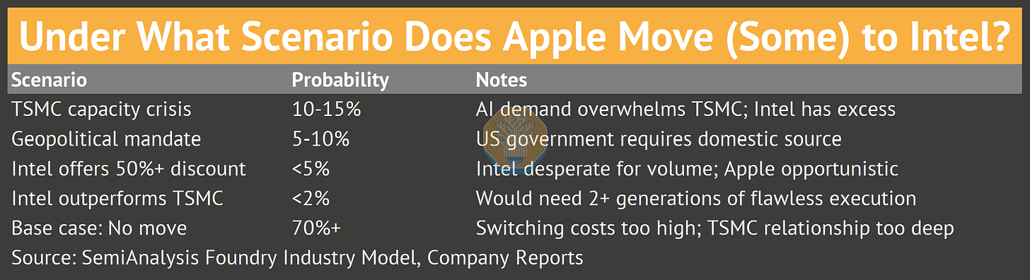 There are a few lower impact possibilities too: while the Intel16 mature node in its Ireland fab could address DTV and connectivity apps, we doubt the capacity is enough to serve Apple. Apple could qualify Intel for lower-risk silicon: WiFi/Bluetooth, display drivers, or power management. That would give Intel reference design wins and Apple supply chain diversification without risking core products.