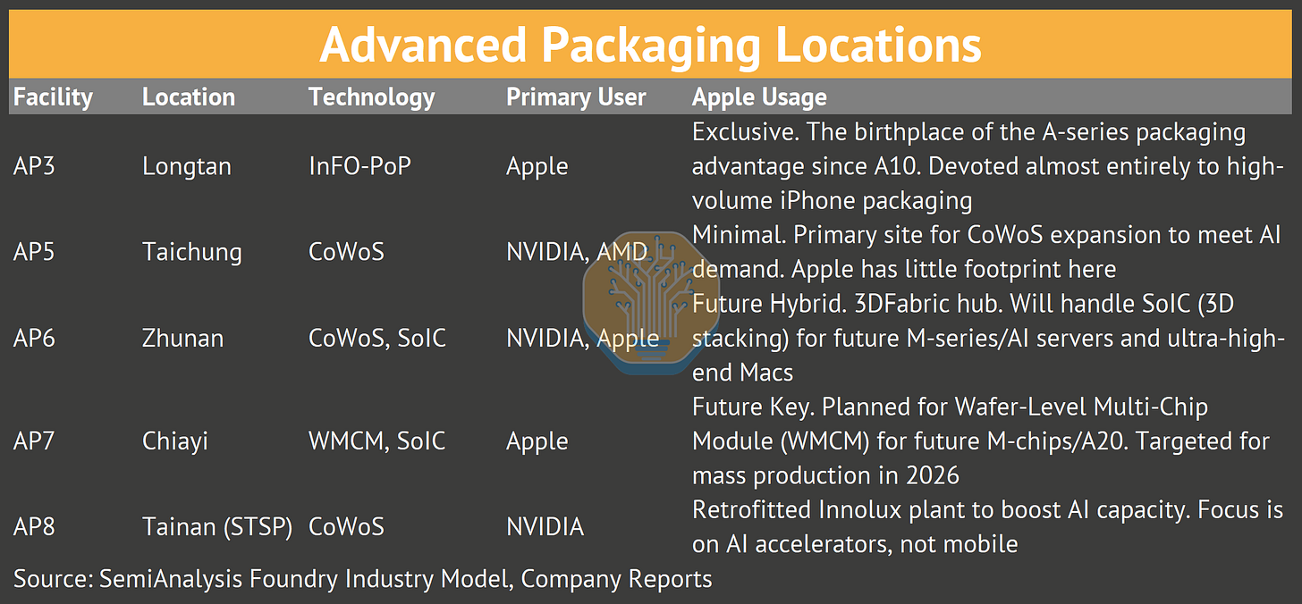 Apple and NVIDIA do not compete for the same packaging lines today. Apple dominates AP3 (InFO), while NVIDIA fights for AP5/AP6 (CoWoS). However, as Apple moves toward M5/M6 Ultra chips utilizing SoIC (System on Integrated Chips) and WMCM, they will begin to compete for the same advanced 3D packaging resources in AP6 and AP7. This convergence of roadmaps poses a future risk for capacity allocation.