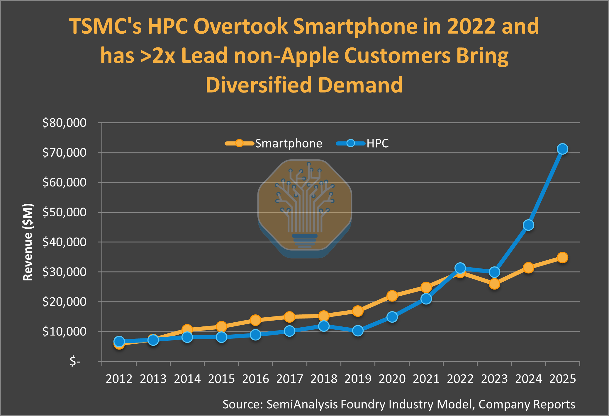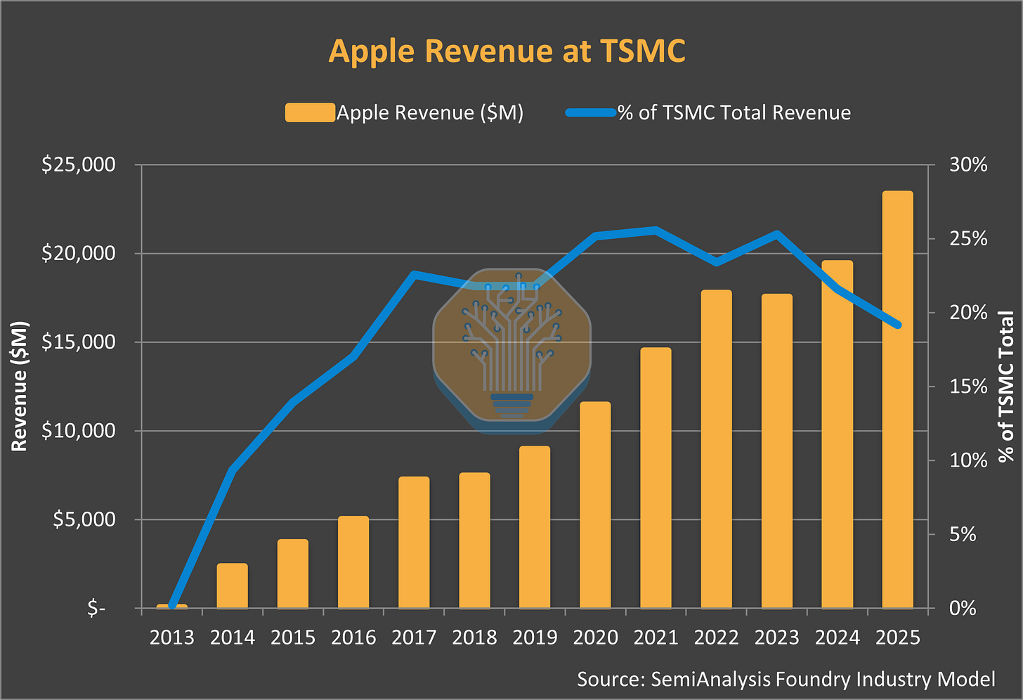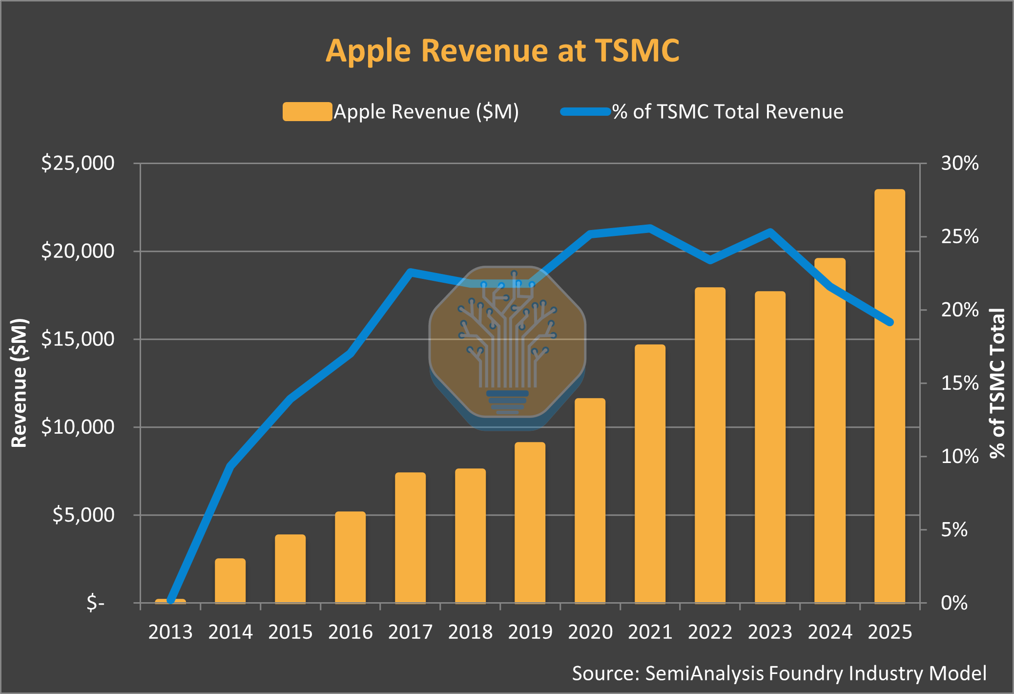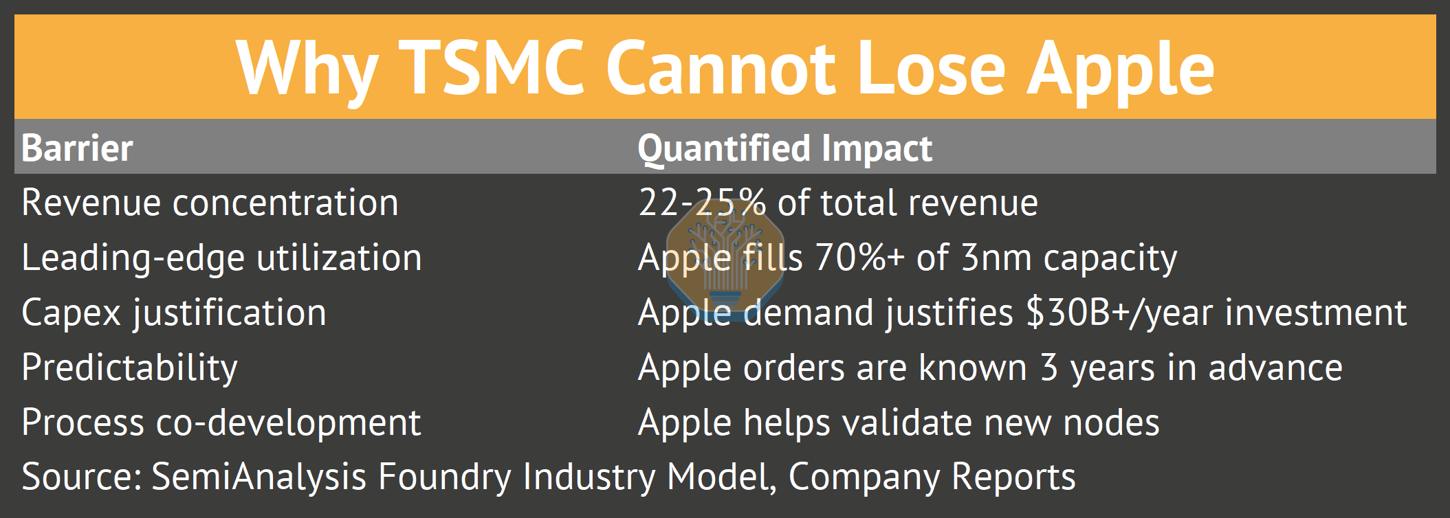 TSMC could not lose Apple. The iPhone brought 22-25% of total revenue and filled 70%+ of 3nm capacity. Apple orders were known three years in advance, allowing TSMC to plan capex with the confidence of a utility company.