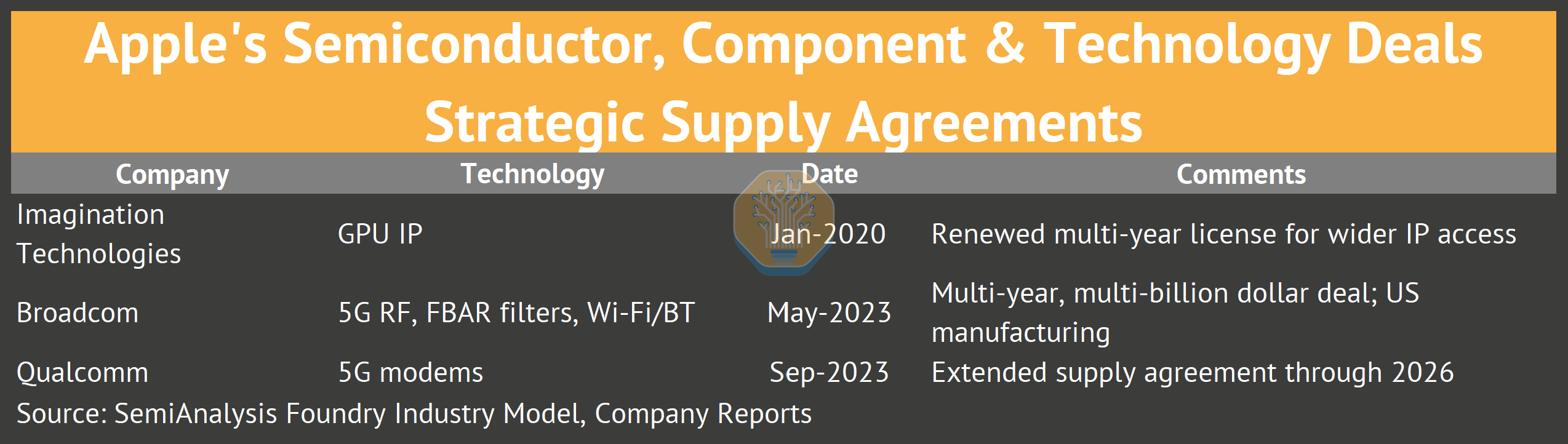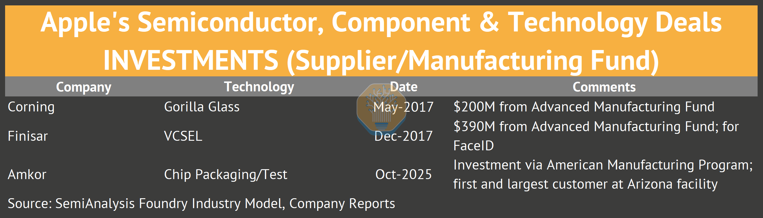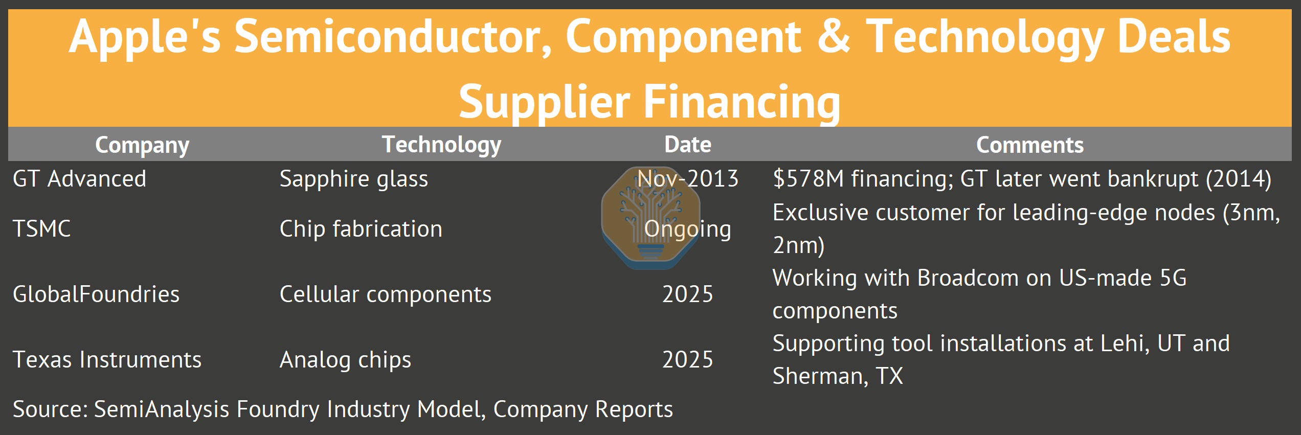 This report traces the Apple-TSMC relationship from Intel’s 2010 rejection through five distinct phases, examining how Apple built its chip empire through acquisitions and 8,000+ engineers across 15 design centers. We analyze why competitors have failed to replicate this vertical integration, map Apple’s manufacturing footprint across Fab 18 and advanced packaging facilities, and assess the strategic questions facing both companies as Intel 18A and Samsung re-engagement become viable alternatives. We’ll also discuss the next phase of the relationship. It’s not just Apple at the leading edge anymore. All of this is quantified with specifics from our proprietary Foundry Industry Model and Apple Wafer Demand Model.