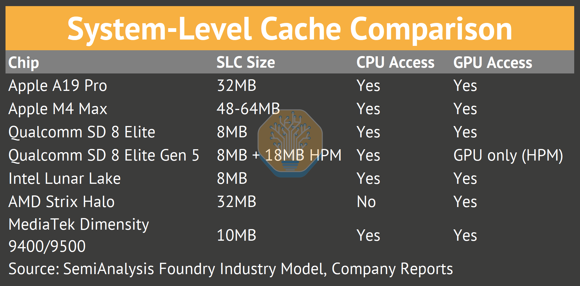 Apple’s SLC advantage is 3-4x larger than competitors with full CPU/GPU sharing. AMD’s Strix Halo matches on size but CPU cores cannot access it.