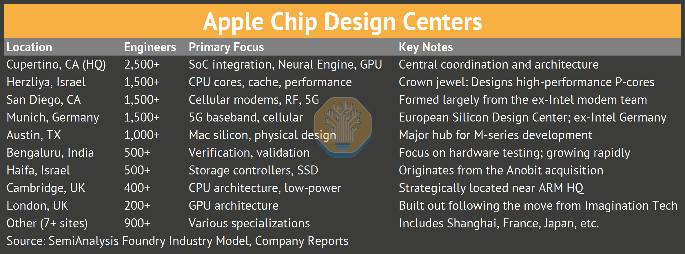 Apple operates 8,000+ chip engineers across 15+ design centers on four continents: