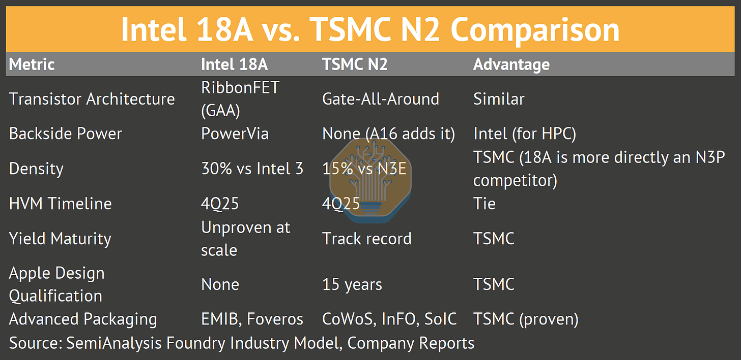 Intel’s 18A-P process (shipping late 2026) represents the first theoretically viable alternative since Apple left Samsung in 2016. Apple could qualify Intel, initially for lower-risk silicon such as base M-series, and yield well. That would give Intel reference design wins and Apple supply chain diversification without risking core products.