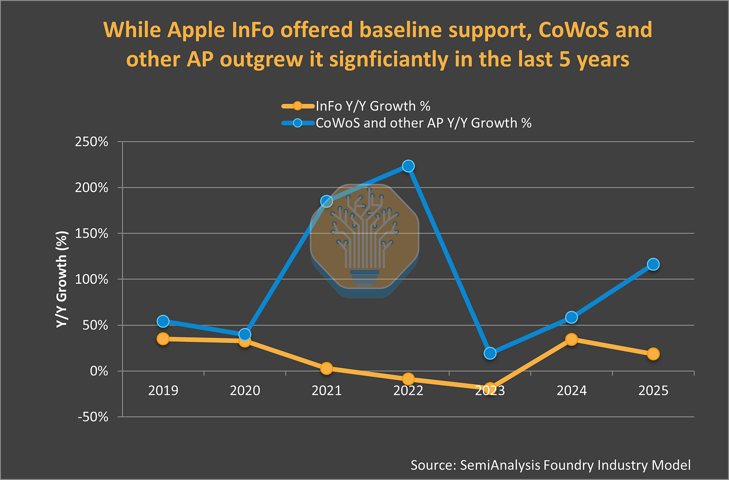 Apple was TSMC’s first advanced packaging customer at scale. InFO revenue grew from $1.8B in 2018 to >$3.5B in 2024, driven entirely by A-series and M-series chips. But CoWoS, TSMC’s AI packaging platform, has surpassed it. CoWoS revenue hit $9.6B in 2025, 2.5x InFO, fueled by Nvidia and AMD demand.