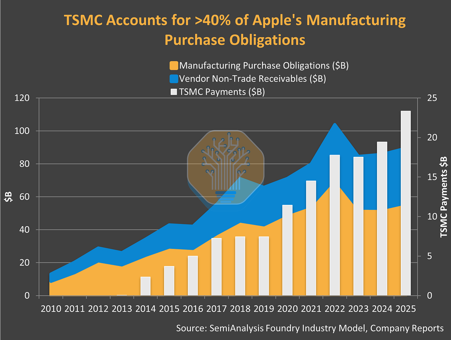 · Manufacturing Purchase Obligations: $8.7B (2010) to $56.2B (2025) = 6.4x growth
