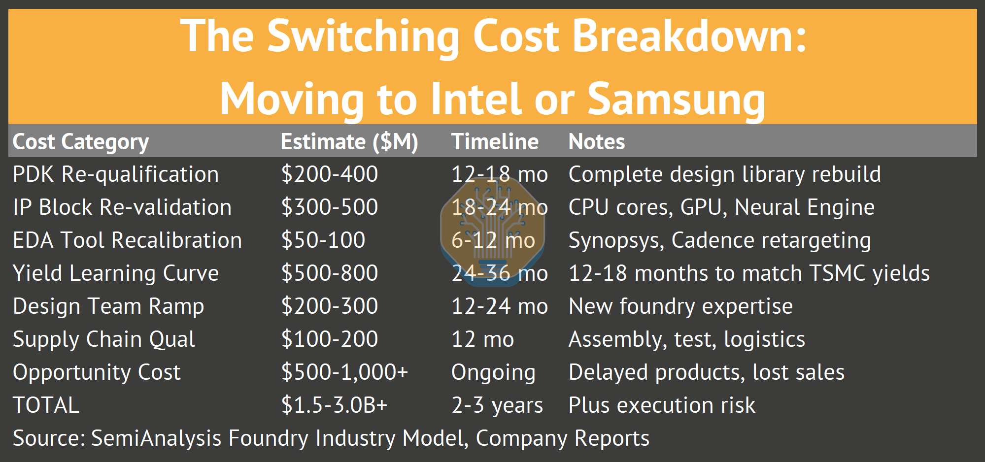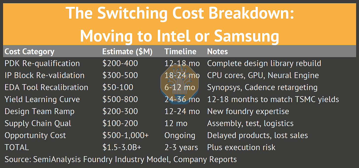 A more serious risk is timing. Apple’s product cadence is synchronized to TSMC’s node roadmap. Moving to Intel or Samsung would mean 2-3 years of inferior products while yield learning catches up. Product upgrade cycles, most importantly the annual iPhone refresh synced with holidays, would also be at risk.