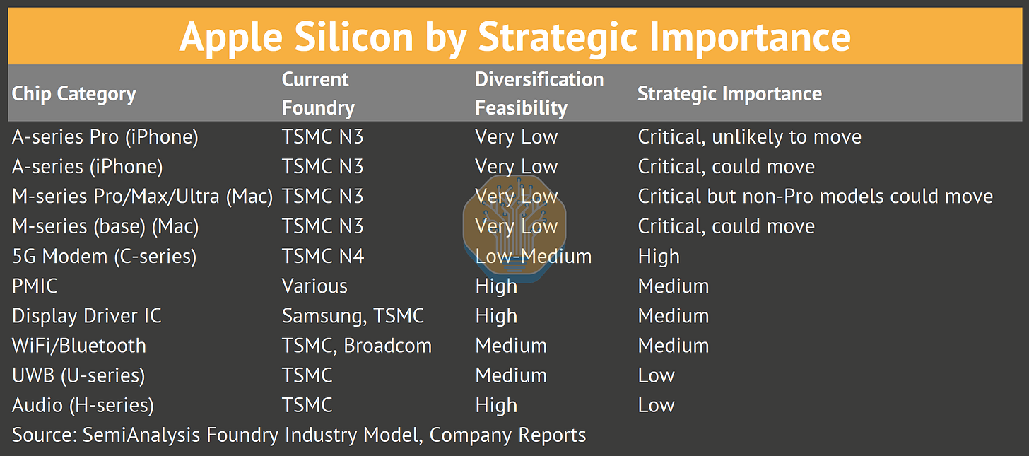 After leaving Samsung in 2016, Apple went exclusive with TSMC. Apple’s diversification strategy is about reducing supply chain risk for non-critical chips.