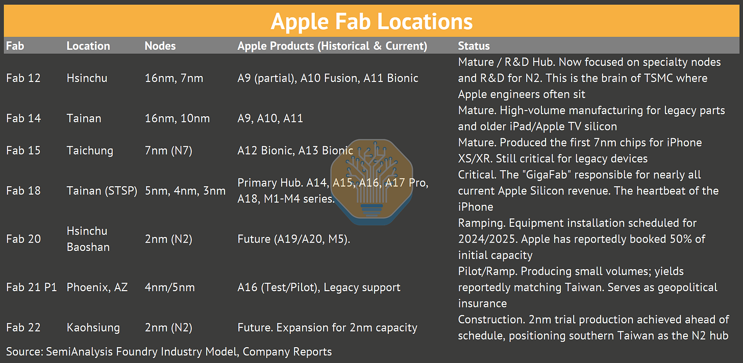 Fab 18 in Tainan is TSMC’s flagship facility for leading-edge production and it’s essentially “Apple’s fab.” The A19 Pro, A18 Pro, M3, M4 and M5 all come from Fab 18’s 3nm lines. This concentration in southern Taiwan is one of the key geopolitical vulnerabilities in Apple’s supply chain.