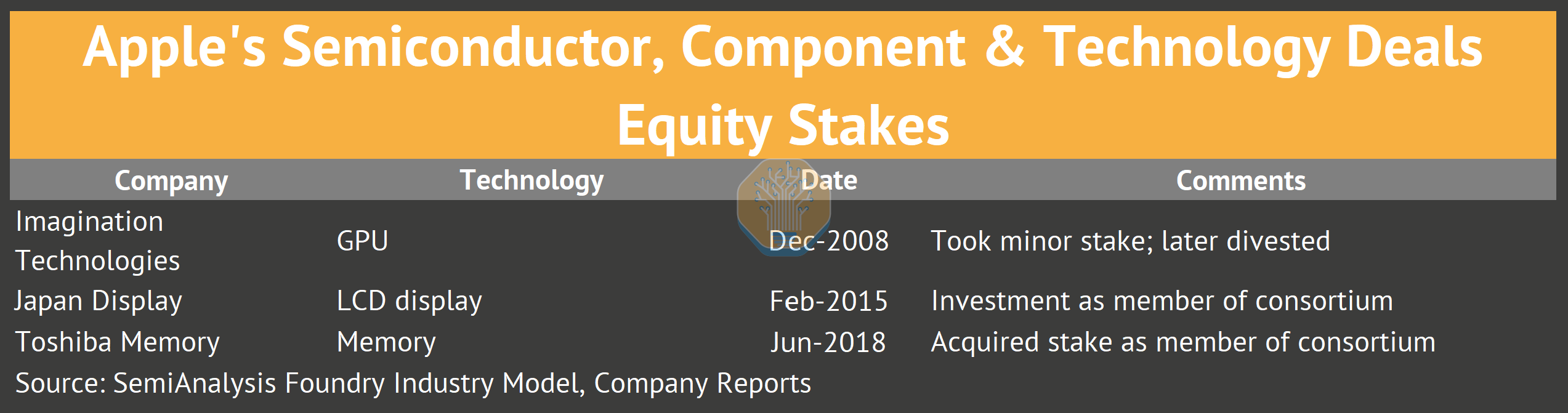 Apple has licensed GPU designs from Imagination Technologies since the original iPhone. In April 2017, Apple notified Imagination they would stop using their IP within 15-24 months. Imagination’s stock dropped 70% overnight.