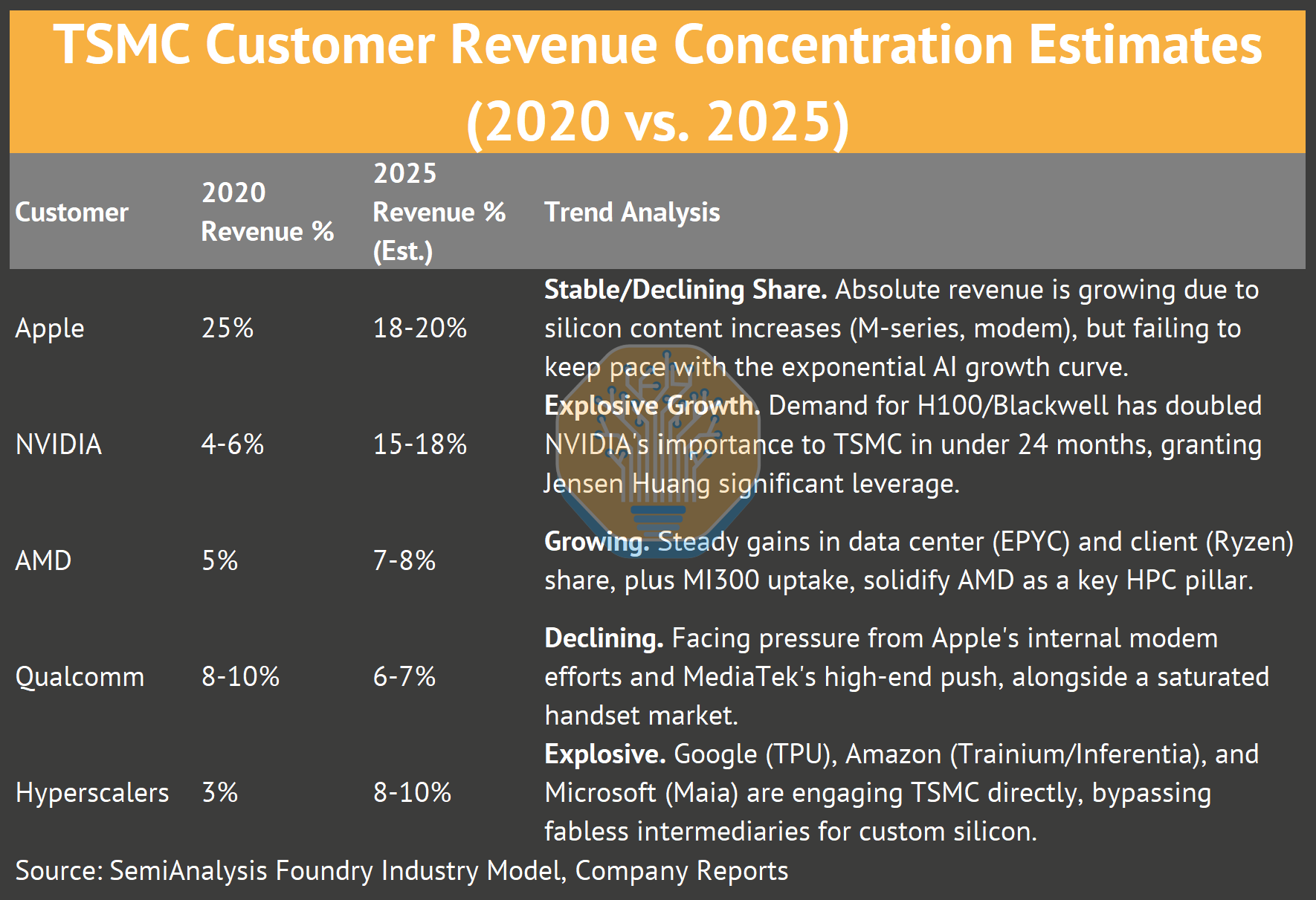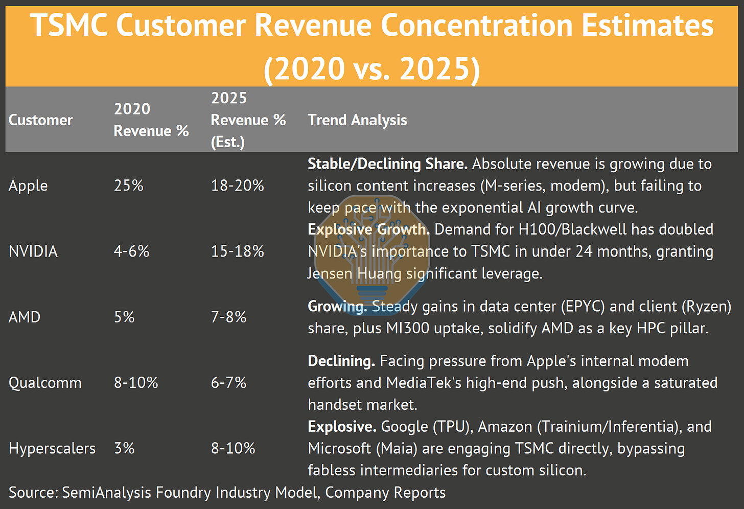 The distinction lies in what these customers are buying. Apple buys leading-edge logic wafers (N3, N3E) and InFO (Integrated Fan-Out) packaging. NVIDIA buys logic wafers (N4, N5) on a custom process a node or 2 behind leading edge but is critically dependent on CoWoS (Chip-on-Wafer-on-Substrate) packaging.
