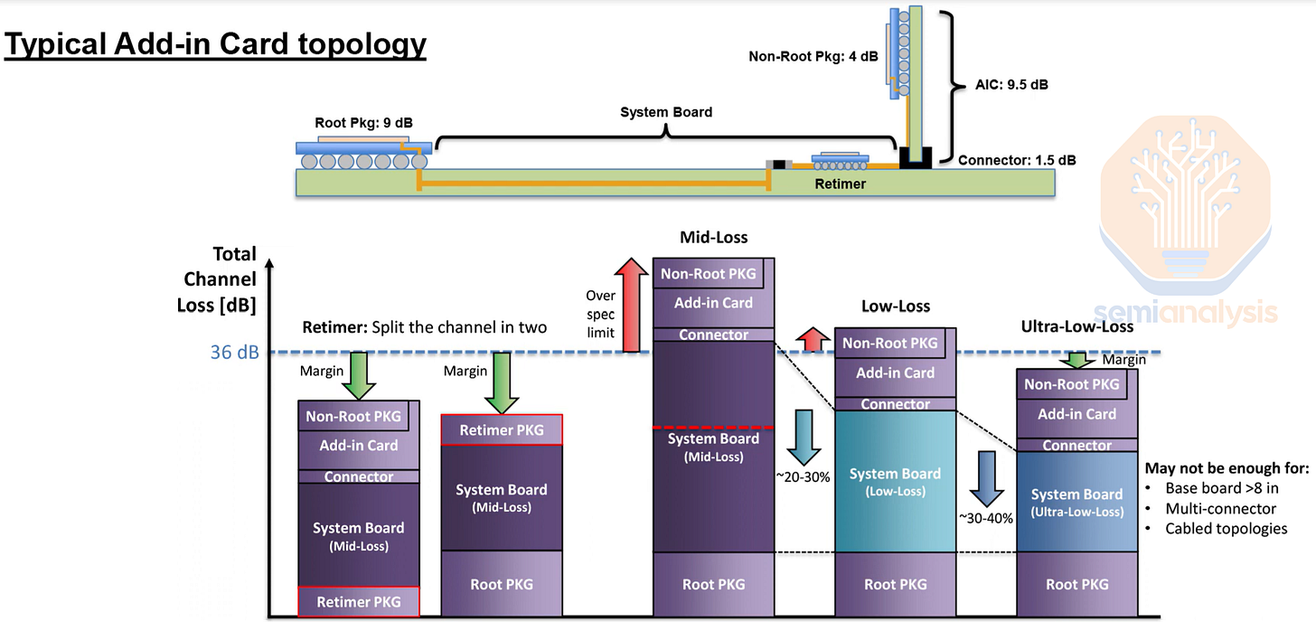 A retimer enables the signal to be split into two channels, significantly reducing the channel loss. The below diagram shows how these chips are integrated to PCBs. This also illustrates how low-loss PCBs, and even ultra-low-loss PCBs, may not be sufficient to have the required channel loss.