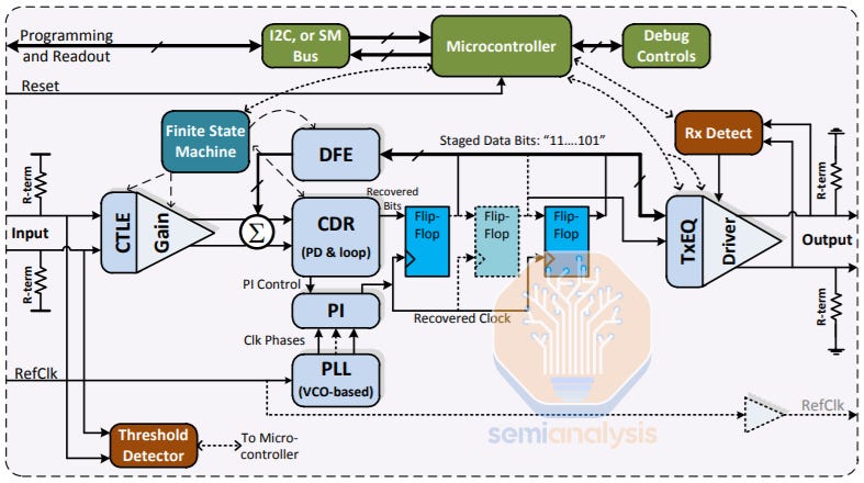 Astera Labs was based on solving the connectivity challenges of PCIe 4 and 5 (specs out in 2019). They built a company around solving these signal integrity challenges and designing a retimer based solution. A retimer is a mixed-signal digital/analog device that is protocol-aware and can fully recover the data, extract the embedded clock and retransmit a fresh copy of the data using a clean clock.