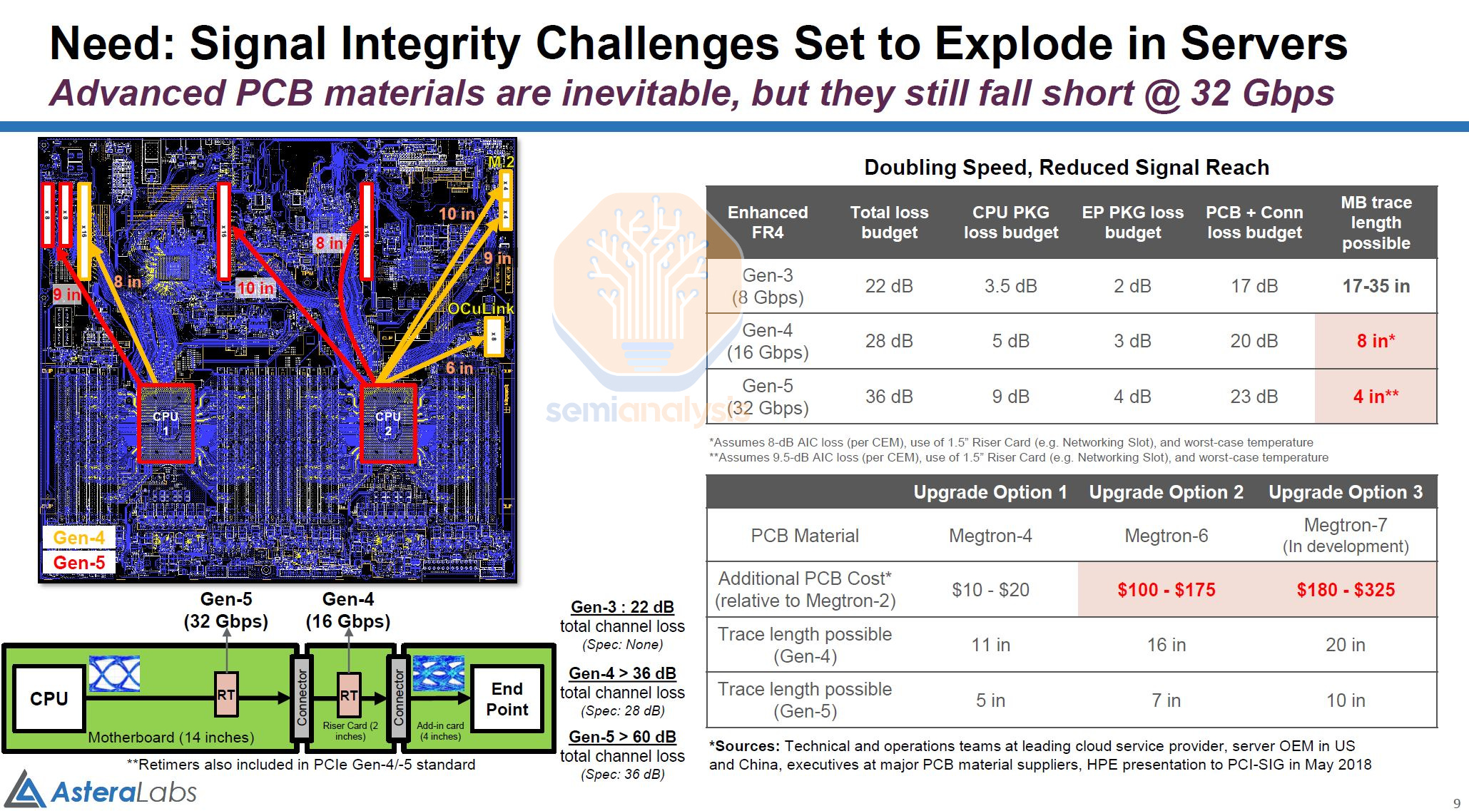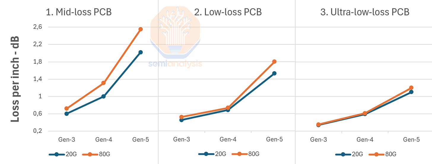 Keep in mind that PCIe specifications have a precise insertion loss budget; in the case of PCIe 5.0, this is 36 dB bump-to-bump for 32 GT/s with a bit error rate less than 10^-12.