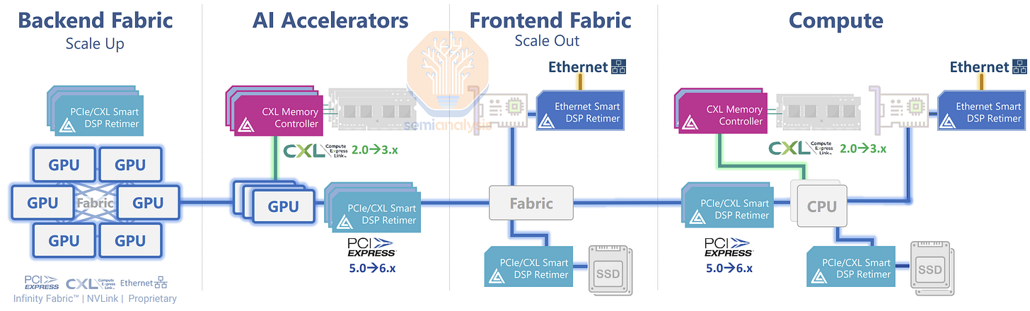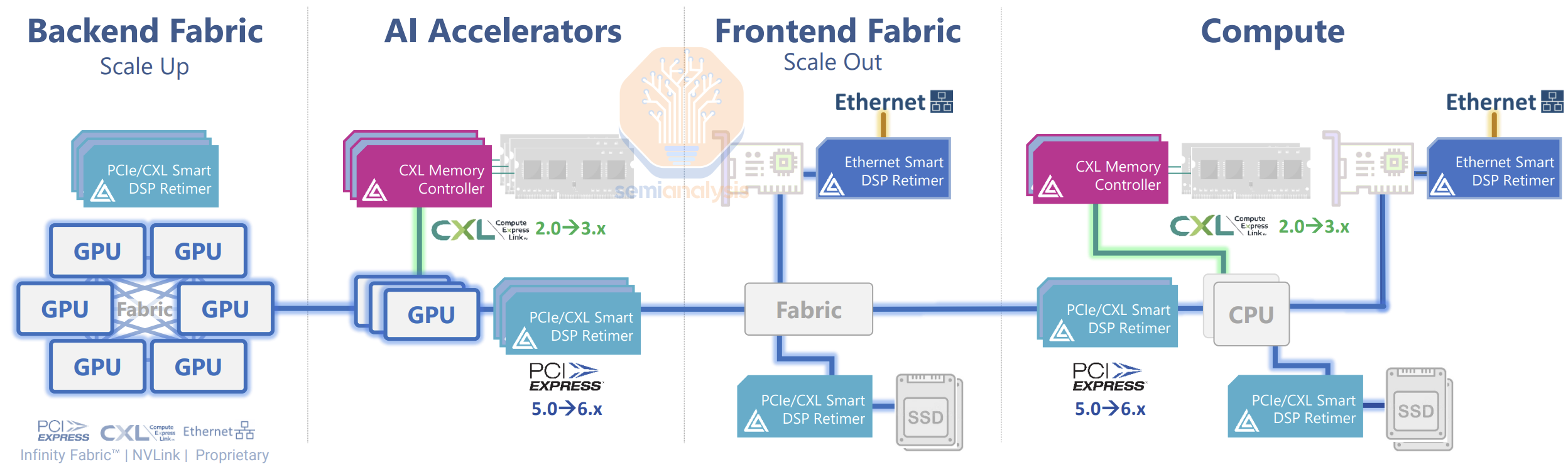 The short answer is yes: as AI accelerator demand continues to fire, the PCIe retimer market will grow too. Indeed, inside each accelerator card is included a retimer. Additional retimers can be found in the server head node, as shown in the image below. The main customers here are AI accelerator vendors and server ODMs.