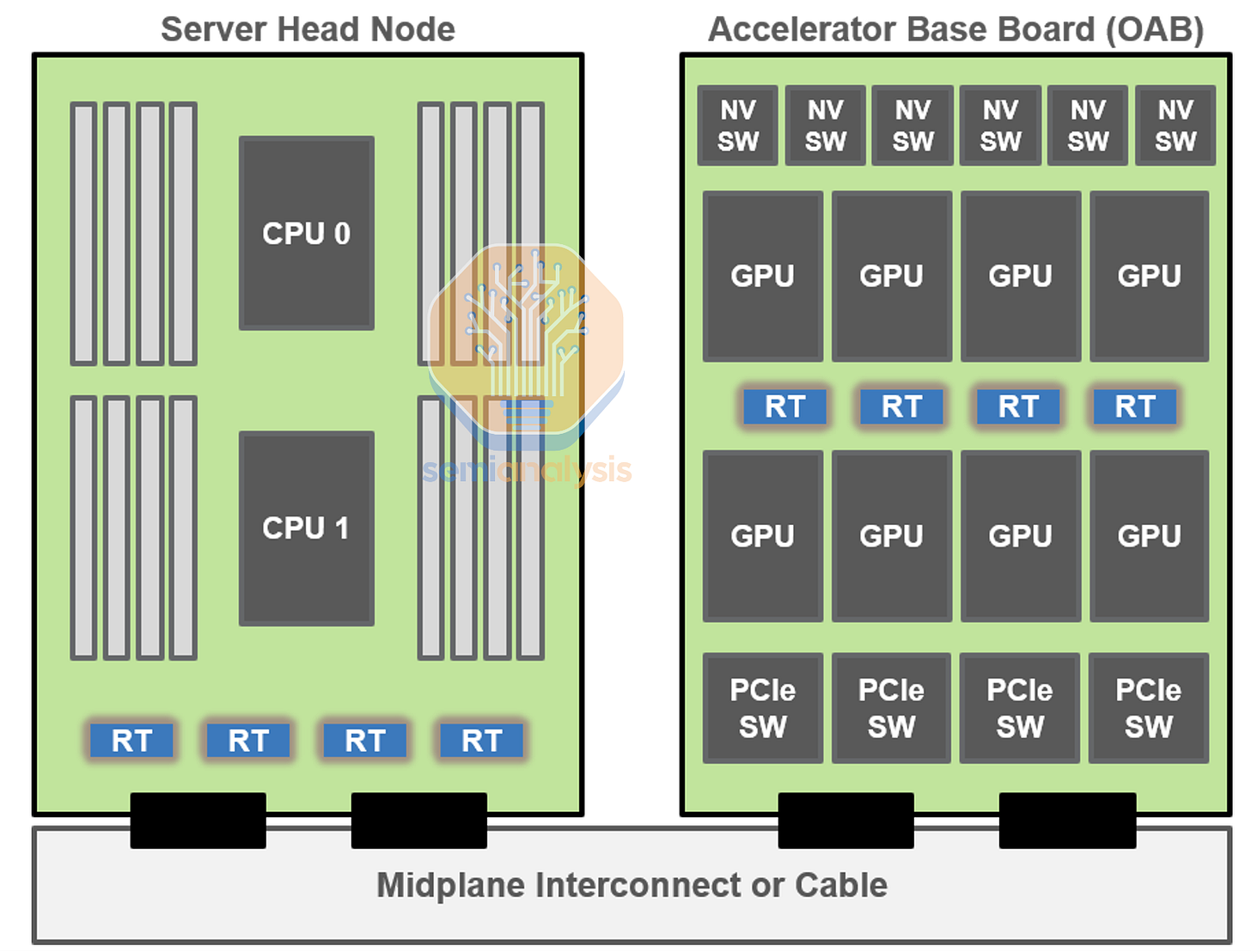 The reason retimers are so popular in accelerated computing systems is Signal Reflection. Alongside distance, this is the second major cause of signal loss in PCB traces or cables. To put it simply, GPU systems are very dense: the above image shows how a baseboard (for example the Nvidia HGX) can include 8 GPUs. Such density induces signal challenges and requires PCIe re-timers. AI servers can include retimers both on the Accelerator baseboard and on the attached Server Head Node. The precise number of units per GPU varies depending on various factors, such as PCB and design layout, and we’ll share our estimates later in the report for subscribers. Different hyperscalers designs contain different numbers of retimers.